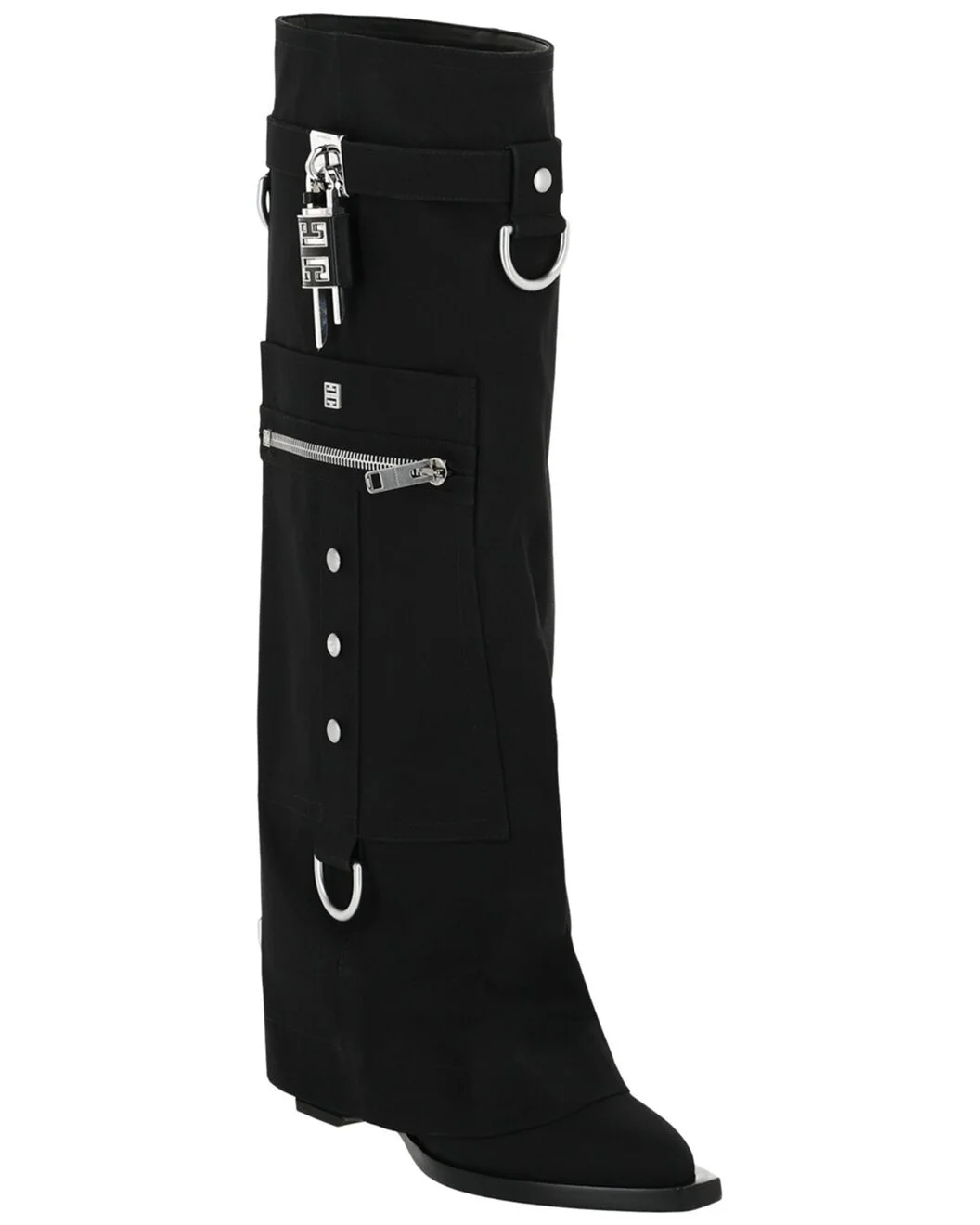 - About the brand: Elegance. Sophistication. Finesse. - Made in Italy - Shark Lock Cowboy Boot in black textile and silver-tone hardware - Elasticized slip-on style - Lightly padded leather insole - 0.5in platform - The Boot Size Guide - Our products are 100% genuine. In some cases we purchase merchandise from trusted independent suppliers and not directly from the brand owner. In all cases we stand by the authenticity of every product sold on our site.