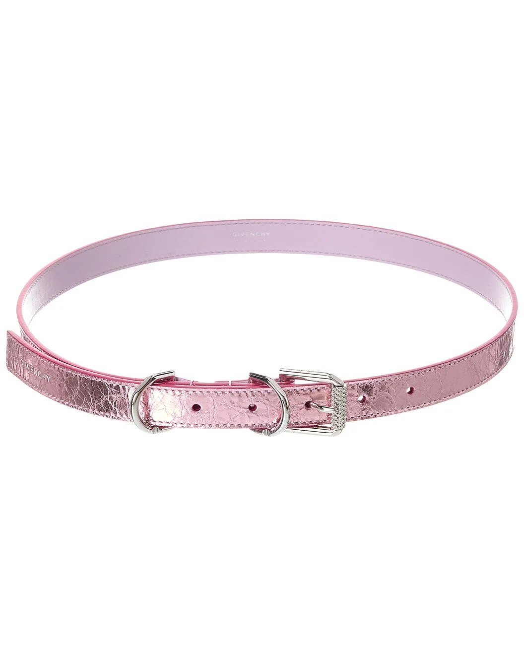 - About the brand: Elegance. Sophistication. Finesse. - Please note: Sizing is in centimeters. Please refer to the size chart for US conversions. - Color/material: metallic pink leather - Design details: silver-tone hardware and pin buckle closure - Measures 0.75in wide - Made in Italy - Please note: All measurements were taken by hand and are approximate; slight variations may occur. - Our products are 100% genuine. In some cases we purchase merchandise from trusted independent suppliers and not directly from the brand owner. In all cases we stand by the authenticity of every product sold on our site.