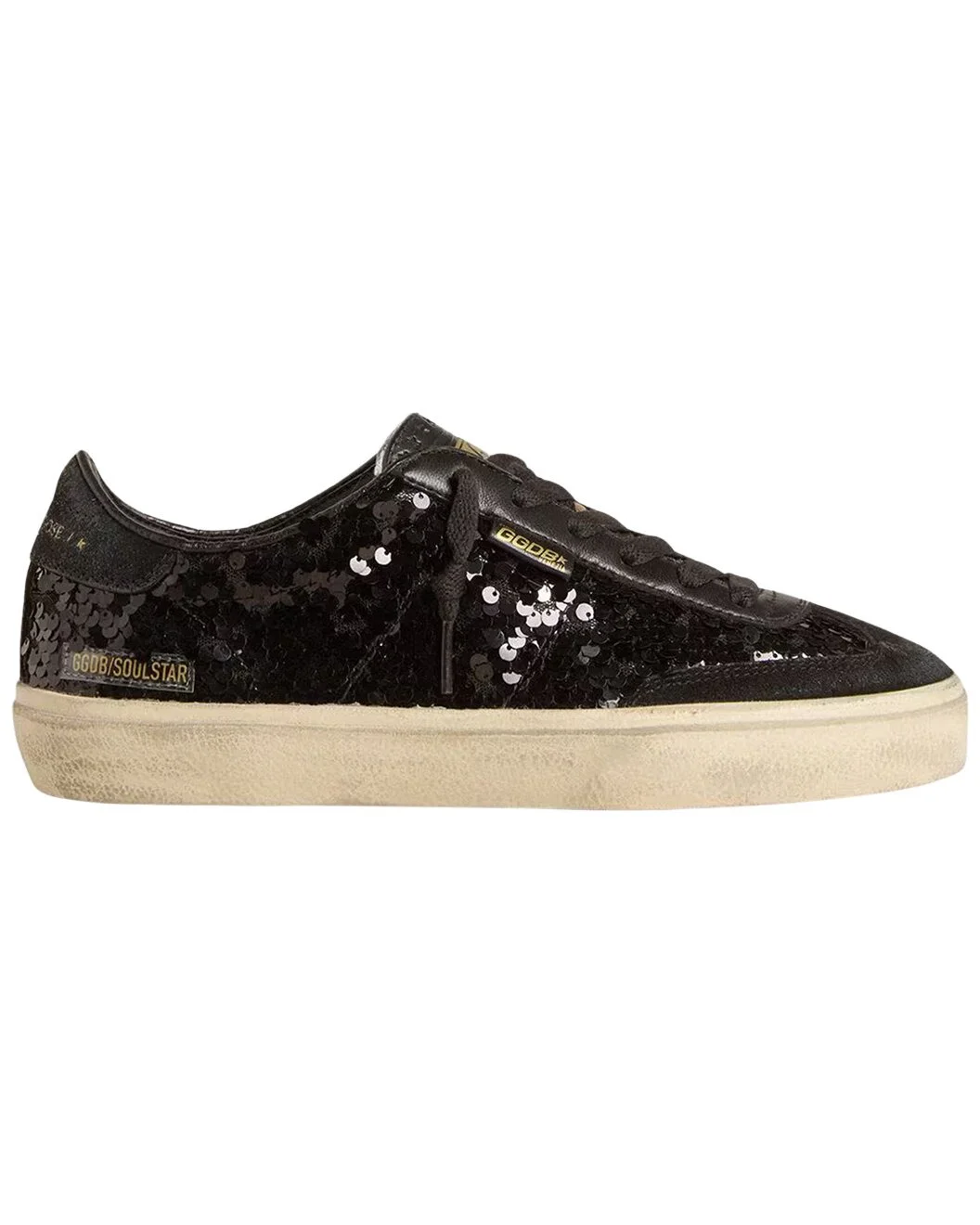 - About the brand: The Golden Goose Manifesto is: lived-in, perfect imperfection. Iconic distressed sneakers and unique street wear rooted in tradition with worldwide inspirations - from Venice to LA. - Please note: Size selections are European. For US conversions, please reference size chart. - Made in Italy - Soul-Star Paillettes Leather Sneaker in black sequin upper and natural-tone hardware with Black sequin upper; Black suede heel tab; Black suede toe; Black nappa leather tongue and inserts; Black laces; Vintage finish; Upper: 45% polyethylene terephthalate, 24% cow leather, 23% sheepskin leather, 8% polyester; Lining: 45% textile polyurethane, 33% cotton, 14% viscose, 8% polyester; Sole: 100% rubber; Handmade; Made in Italy - Lace-up closure - Moderately padded footbed - Rubber sole - Our products are 100% genuine. In some cases we purchase merchandise from trusted independent suppliers and not directly from the brand owner. In all cases we stand by the authenticity of every product sold on our site.