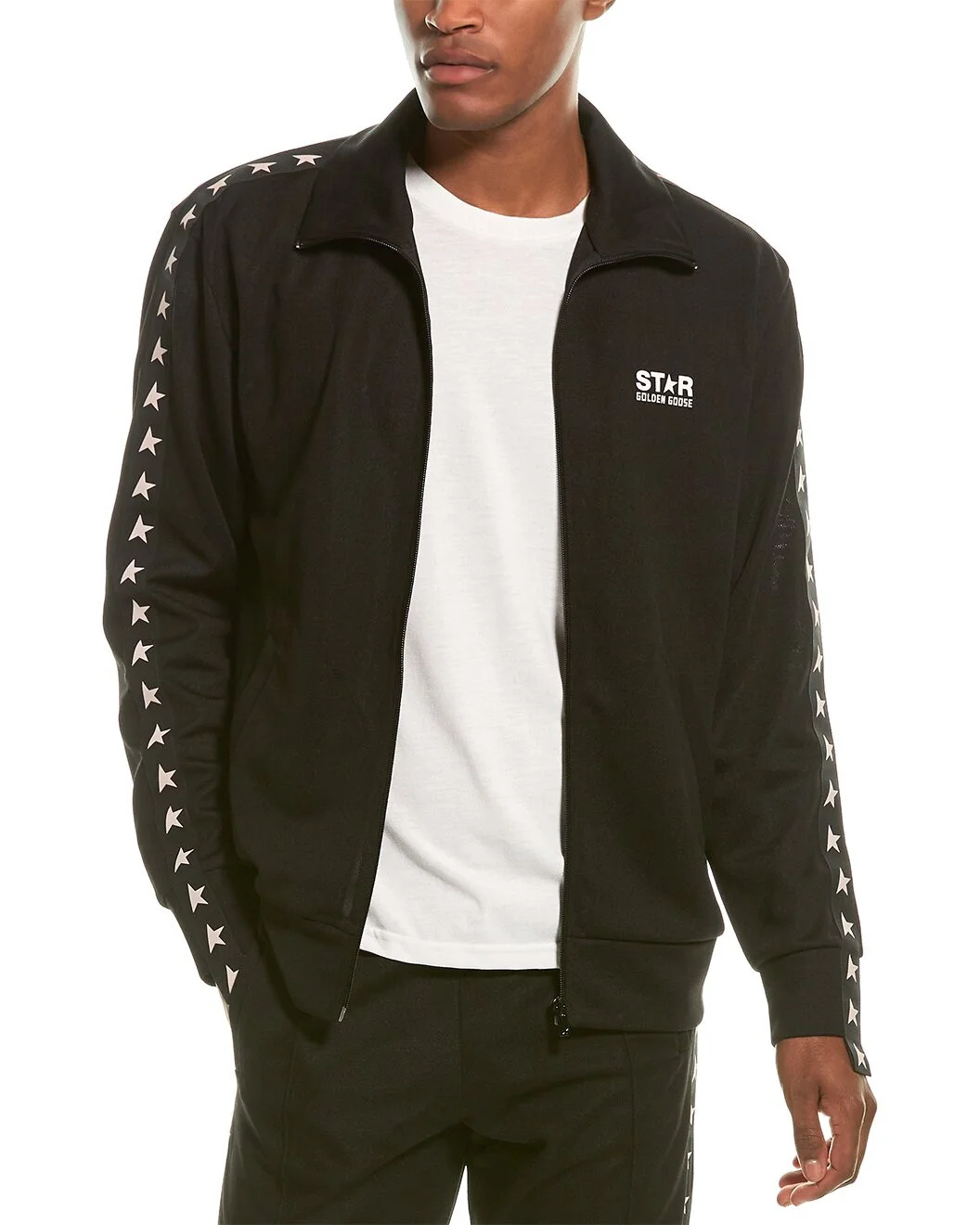 - About the brand: The Golden Goose Manifesto is: lived-in, perfect imperfection. Iconic distressed sneakers and unique street wear rooted in tradition with worldwide inspirations - from Venice to LA. - Star Collection Zipped Sweatshirt in black with stand collar, two front pockets and printed taping - Approximately 30in from shoulder to hem - Model is 6'0 and is wearing a size medium. Measurements may vary slightly by size. - Zipper closure - 100% polyester - Machine wash - Made in Italy - Our products are 100% genuine. In some cases we purchase merchandise from trusted independent suppliers and not directly from the brand owner. In all cases we stand by the authenticity of every product sold on our site.
