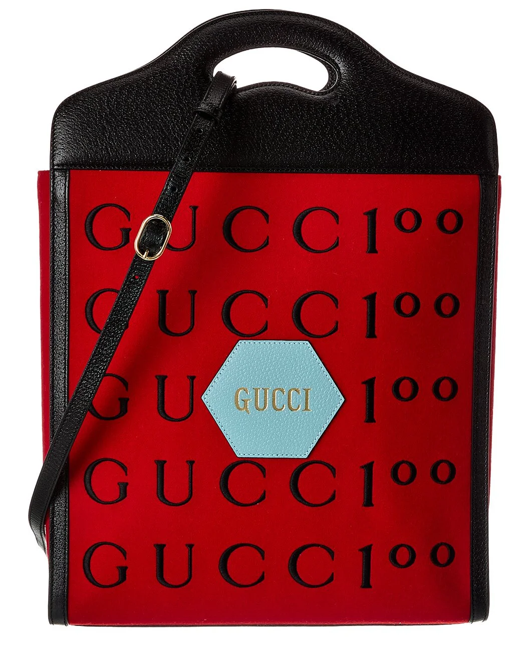 - About the brand: Eclectic and coveted. Italian luxury redefined. - Made in Italy - Centennial 100 Medium Canvas & Leather Tote in red canvas and black leather and light fine gold hardware with logo embroidery - Interior design details: canvas interior, leather wall pocket - Measures 13.5in wide x 16.5in high x 2.5in deep - Top handles drop 2in - Adjustable and removable shoulder strap drops 26in - Open top - Please note: All measurements were taken by hand and are approximate; slight variations may occur. - Our products are 100% genuine. In some cases we purchase merchandise from trusted independent suppliers and not directly from the brand owner. In all cases we stand by the authenticity of every product sold on our site.