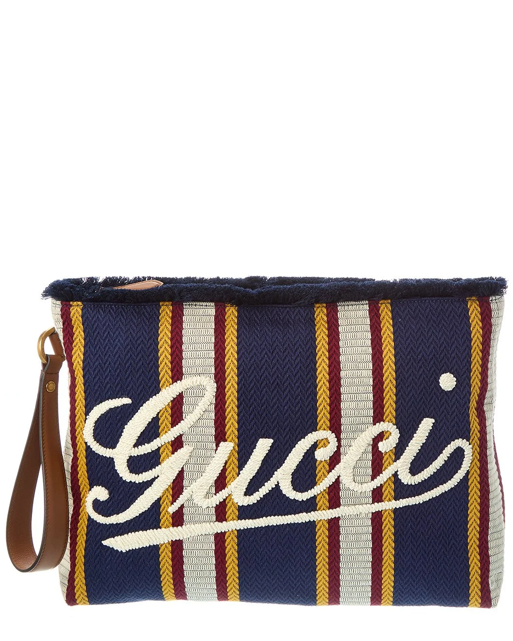 - About the brand: Eclectic and coveted. Italian luxury redefined. - Made in Italy - Embroidered Canvas & Leather Pouch in blue canvas and brown leather and light fine gold hardware with logo embroidery - Interior design details: unlined - Measures 14.2in wide x 9in high x 3in deep - Wrist strap drops 7in - Zipper closure - Please note: All measurements were taken by hand and are approximate; slight variations may occur. - Our products are 100% genuine. In some cases we purchase merchandise from trusted independent suppliers and not directly from the brand owner. In all cases we stand by the authenticity of every product sold on our site.