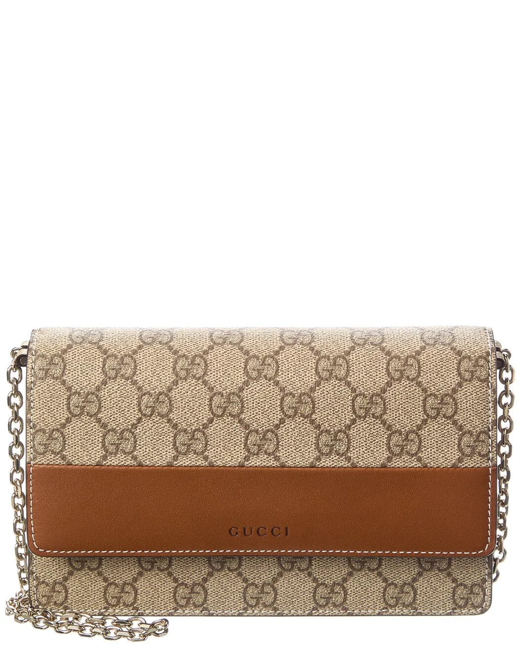 - About the brand: Eclectic and coveted. Italian luxury redefined. - Made in Italy - GG Emblem GG Supreme Canvas & Leather Wallet On Chain in GG supreme canvas and leather and light fine gold hardware with chain strap - Interior design details: GG Supreme canvas and taffeta lining, zippered pocket, card slots, bill compartments - Measures 8in wide x 5in high x 1.5in deep - Removable shoulder strap drops 21in - Fold-over flap with magnetic closure - Please note: All measurements were taken by hand and are approximate; slight variations may occur. - Our products are 100% genuine. In some cases we purchase merchandise from trusted independent suppliers and not directly from the brand owner. In all cases we stand by the authenticity of every product sold on our site.