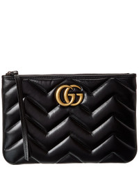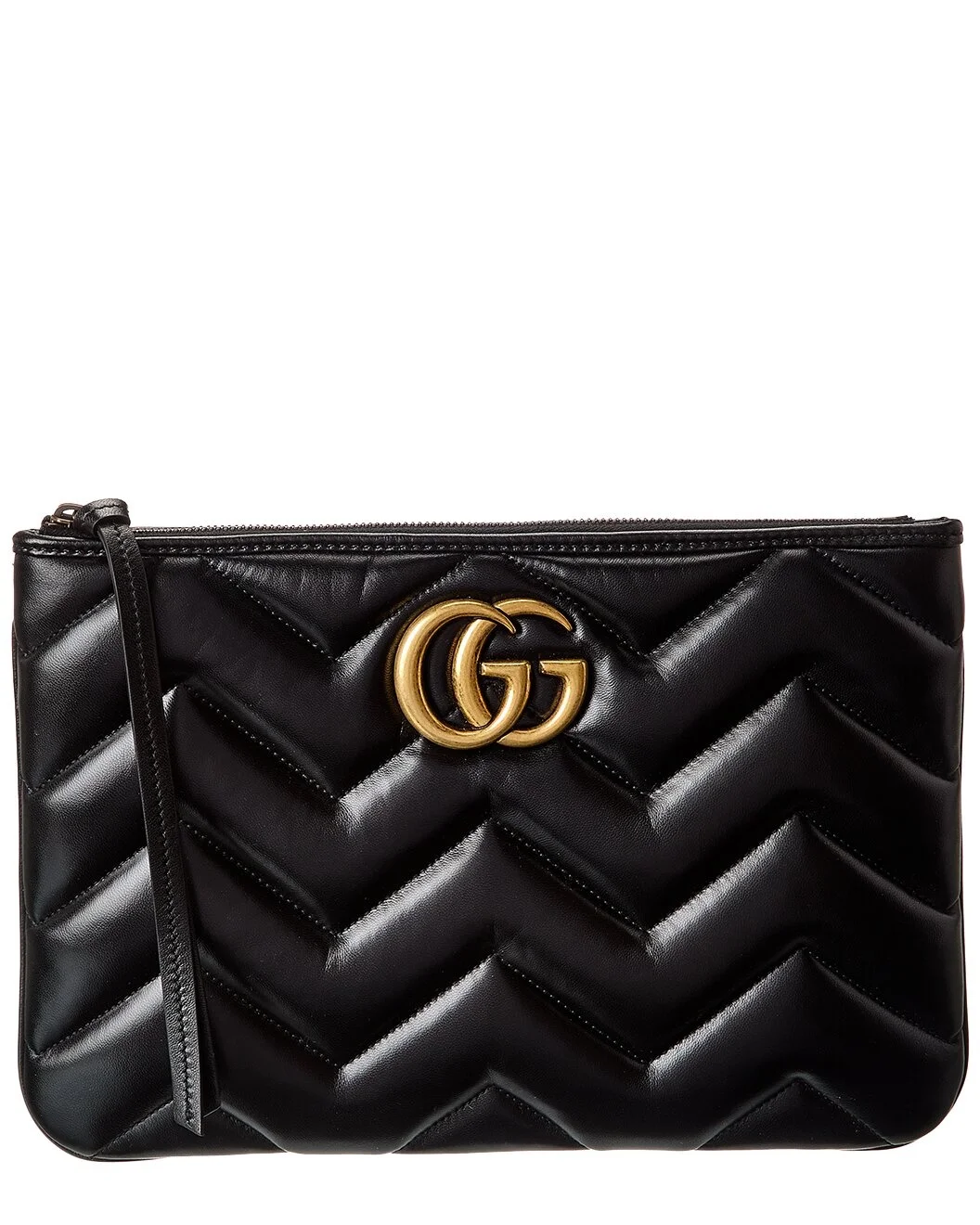 - About the brand: Eclectic and coveted. Italian luxury redefined. - Made in Italy - GG Marmont Leather Clutch in black matelasse leather and light fine gold hardware with interlocking G logo accent - Interior design details: microfiber lining - Measures 12in wide x 8.5in high x 1in deep - Zipper closure - Please note: All measurements were taken by hand and are approximate; slight variations may occur. - Our products are 100% genuine. In some cases we purchase merchandise from trusted independent suppliers and not directly from the brand owner. In all cases we stand by the authenticity of every product sold on our site.