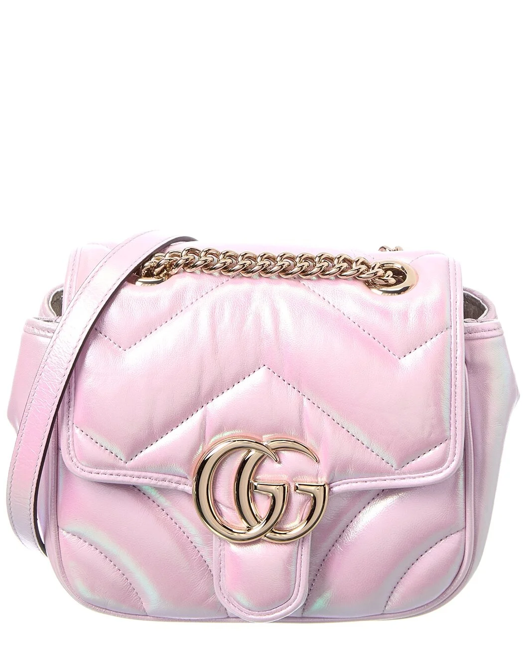 - About the brand: Eclectic and coveted. Italian luxury redefined. - Made in Italy - GG Marmont Mini Matelasse Leather Shoulder Bag in pink iridescent leather and light fine gold hardware with interlocking G logo - Interior design details: one flat pocket - Measures 7in wide x 5.9in high x 3.1in deep - Removable chain shoulder strap drop 22.8in - Magnetic snap button closure - Please note: All measurements were taken by hand and are approximate; slight variations may occur. - Our products are 100% genuine. In some cases we purchase merchandise from trusted independent suppliers and not directly from the brand owner. In all cases we stand by the authenticity of every product sold on our site.