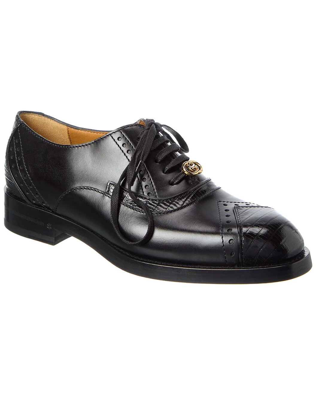 - About the brand: Eclectic and coveted. Italian luxury redefined. - Please note: Size selections are European. For US conversions, please reference size chart. - Made in Italy - Leather Loafer in black leather and gold-tone hardware. Delicate gold-toned Interlocking G design. Lizardskin print for added detail. Brogue Design Detail. Flat Sole. 20mm Height. - Lace-up closure - Moderately padded footbed - Leather sole - 0.8in heel - Our products are 100% genuine. In some cases we purchase merchandise from trusted independent suppliers and not directly from the brand owner. In all cases we stand by the authenticity of every product sold on our site.