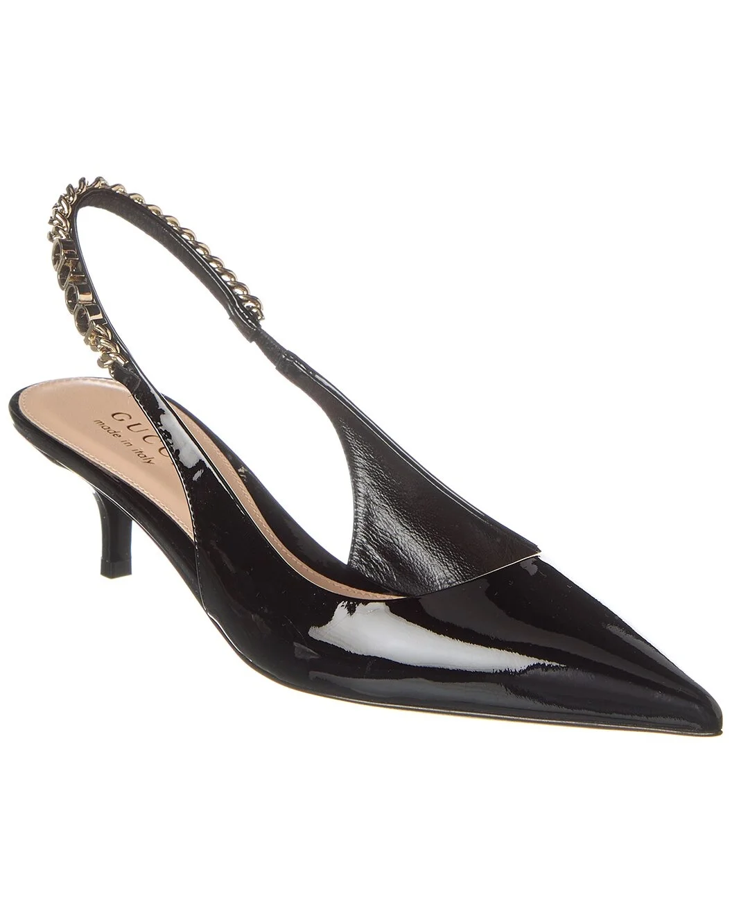 - About the brand: Eclectic and coveted. Italian luxury redefined. - Please note: Size selections are European. For US conversions, please reference size chart. - Based on feedback from Members, this item typically runs large. We suggest sizing down. - Made in Italy - Signoria Patent Slingback Pump in black patent leather and light fine gold hardware with logo chain trim - Lightly padded leather insole - Smooth leather sole - 1.75in heel - Please note: All measurements are approximate and were taken from a size 37; slight variations may occur. - Our products are 100% genuine. In some cases we purchase merchandise from trusted independent suppliers and not directly from the brand owner. In all cases we stand by the authenticity of every product sold on our site.