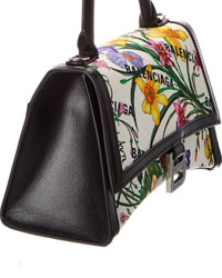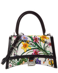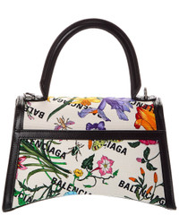 - About the brand: Eclectic and coveted. Italian luxury redefined. - Made in Italy - x Balenciaga Hourglass Small Canvas & Leather Shoulder Bag in white printed canvas and black leather and dark silver hardware with exterior pocket - Interior design details: leather lining, zippered pocket - Measures 8.75in wide x 6in high x 4in deep - Top handle drops 4in - Adjustable and removable shoulder strap drops 27in - Fold-over flap with magnetic closure - Please note: All measurements were taken by hand and are approximate; slight variations may occur. - Our products are 100% genuine. In some cases we purchase merchandise from trusted independent suppliers and not directly from the brand owner. In all cases we stand by the authenticity of every product sold on our site.