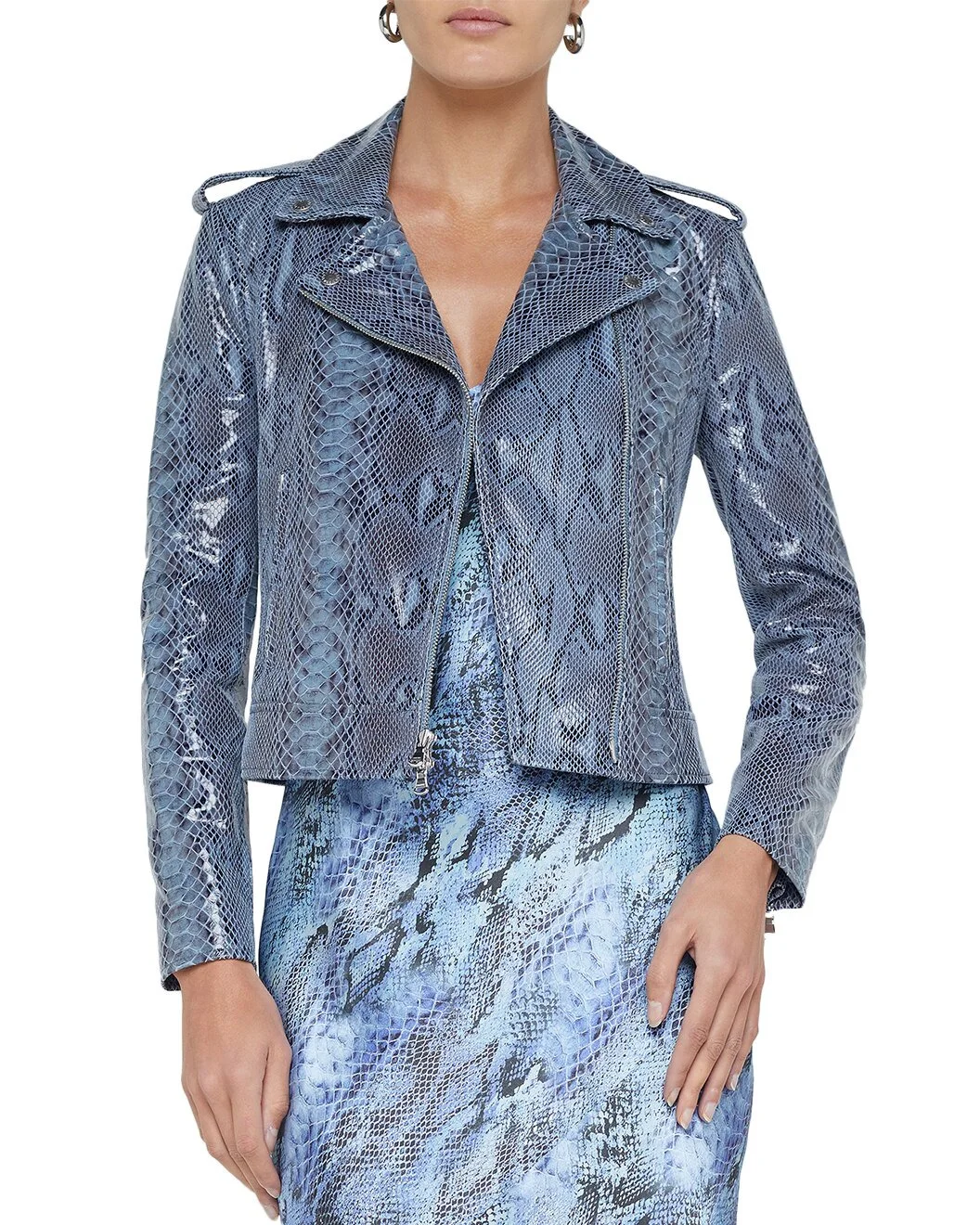 - Color/pattern: blue snake - Approximately 20.6in from shoulder to hem - Measurements taken from a size 2 and may vary slightly by size. - Zipper - 100% lambskin - Dry clean only - Imported