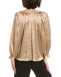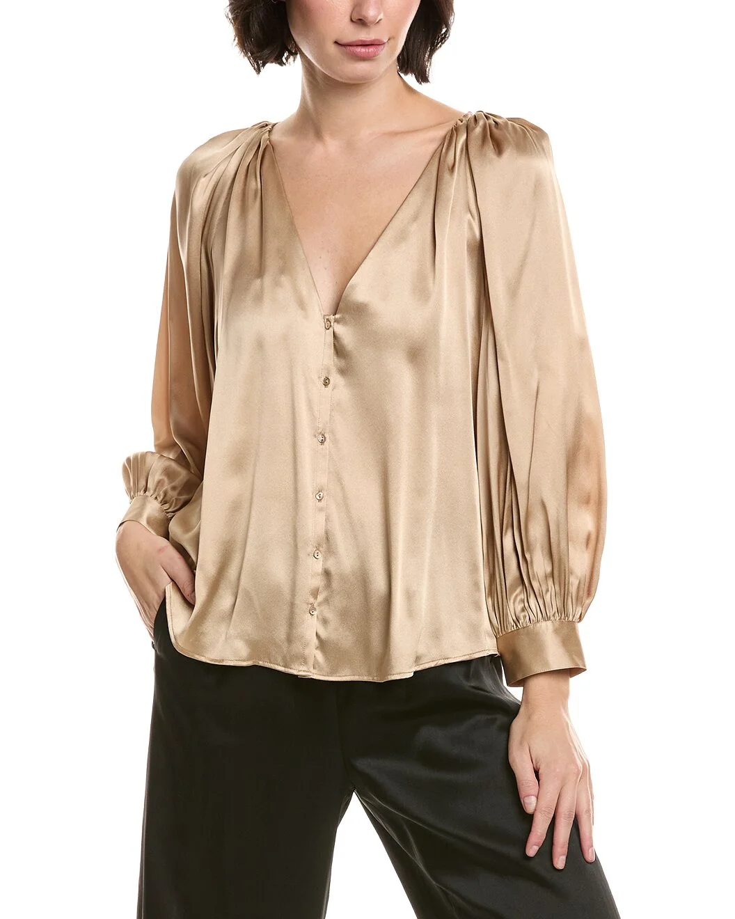 - Color/pattern: almond - Approximately 25in from shoulder to hem - Model is 5'9 and is wearing a size small. Measurements may vary slightly by size. - Design details: balloon sleeves and shirred detailing - Button front - 100% silk - Dry clean only - Imported