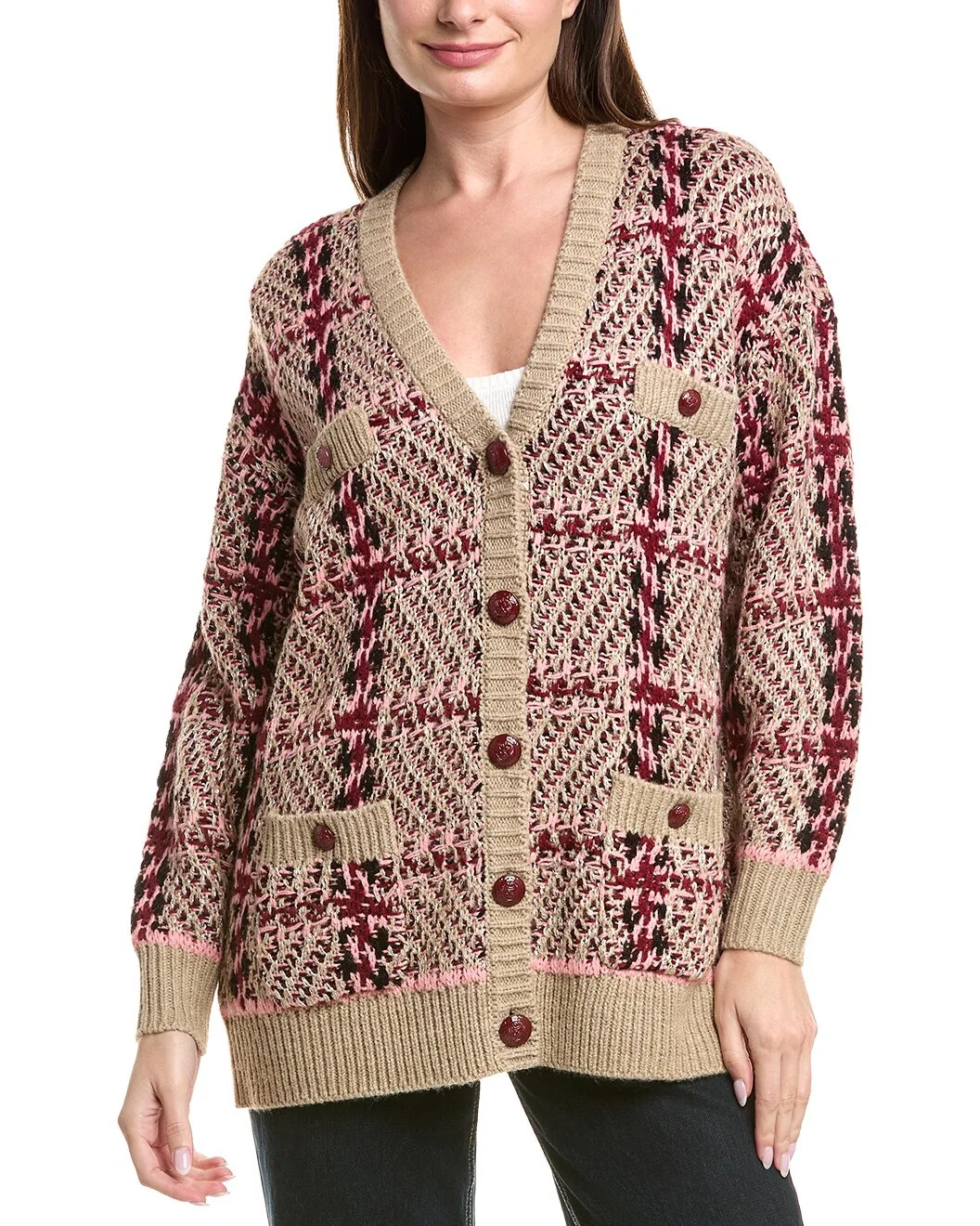 - Color/pattern: natural/pink/burg/black sequin - Approximately 28in from shoulder to hem - Measurements taken from a size 2/25/XS and may vary slightly by size. - 63% acrylic 13% wool, 13% nylon 11% polyester - Dry clean only - Imported