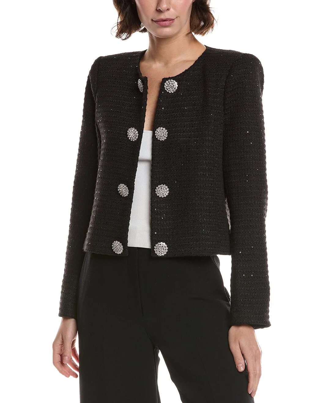 - Color/pattern: black - Approximately 20in from shoulder to hem - Model is 5'9 and is wearing a size 4. Measurements may vary slightly by size. - Design details: shoulder padding and sequin and brooch embellishments - Open front - 83% polyester, 10% cotton, 6% rayon, 1% other - Lining: 100% polyester - Dry clean only - Imported
