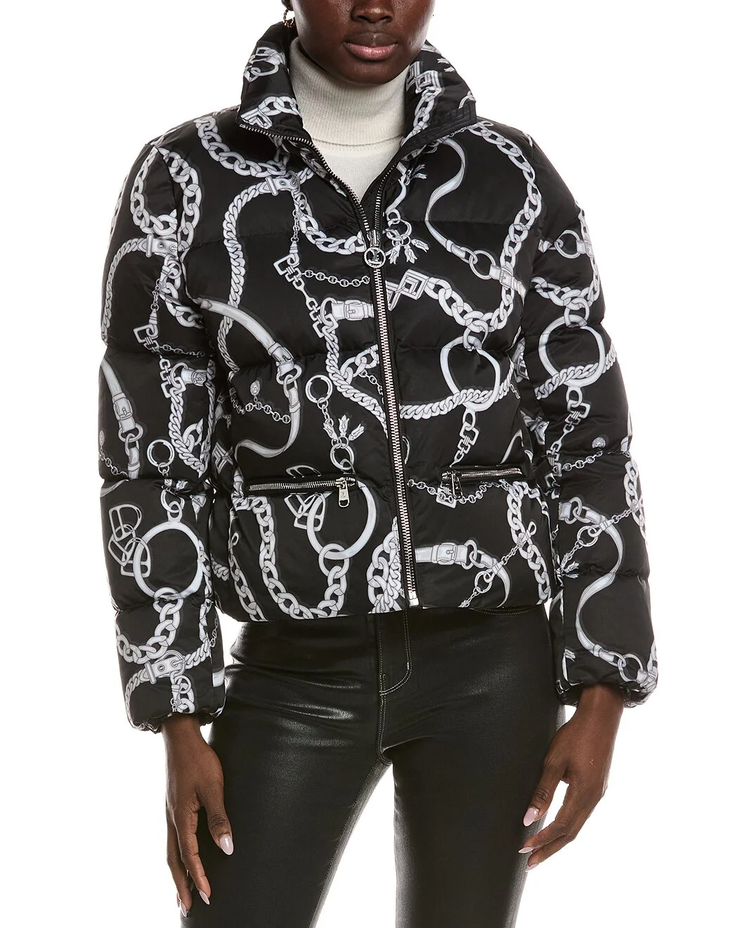 - Color/pattern: black and white - Approximately 22in from shoulder to hem - Model is 5'10 and is wearing a size small. Measurements may vary slightly by size. - Design details: stand collar, and front zip pockets - Zipper front - 100% polyester - Fill: 90% down, 10% feathers - Hand wash - Imported