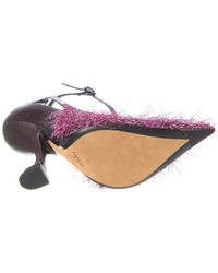 - Price as marked - Please note: Size selections are European. For US conversions, please reference size chart. - Made in Italy - Color/material: purple embossed leather - Design details: black hardware, pink tinsel detailing - Adjustable ankle strap with buckle closure - Lightly padded leather insole - Smooth leather sole - 4.5in heel - Please note: All measurements are approximate and were taken from a size 37; slight variations may occur. - Our products are 100% genuine. In some cases we purchase merchandise from trusted independent suppliers and not directly from the brand owner. In all cases we stand by the authenticity of every product sold on our site.