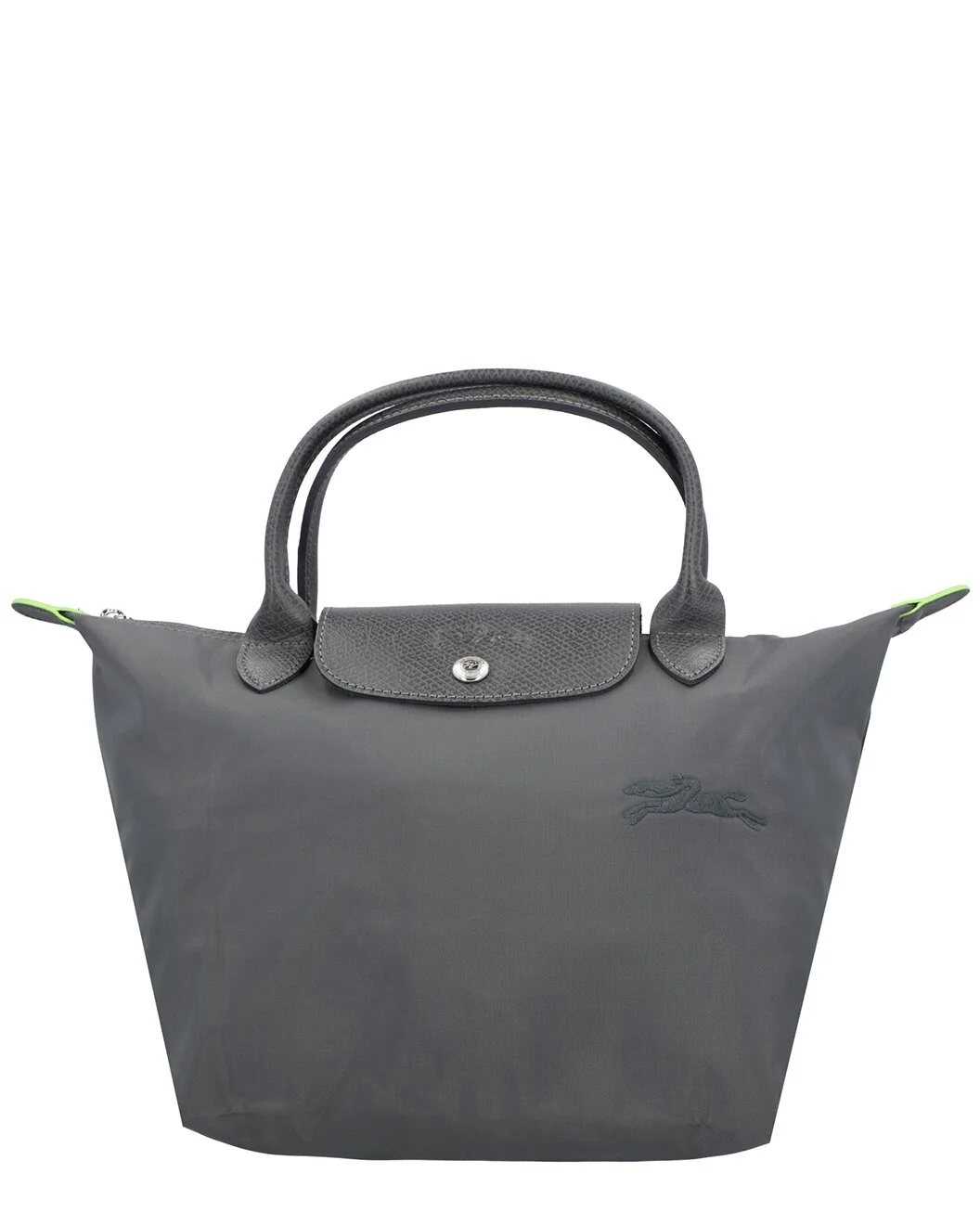 - About the brand: Understated luxury leather goods with a French elegance. - Please note: Le Pliage Green is a specific collection from Longchamp highlighting recycled materials and does not represent the color of the bags within the line. - Made in France - Le Pliage Green Small Canvas Bag in grey nylon with Longchamp logo - Interior design details: leather lining - Measures 9.05in wide at base x 8.66in high x 5.51in deep - Snap button and zipper closures - Please note: All measurements were taken by hand and are approximate; slight variations may occur. - Our products are 100% genuine. In some cases we purchase merchandise from trusted independent suppliers and not directly from the brand owner. In all cases we stand by the authenticity of every product sold on our site.