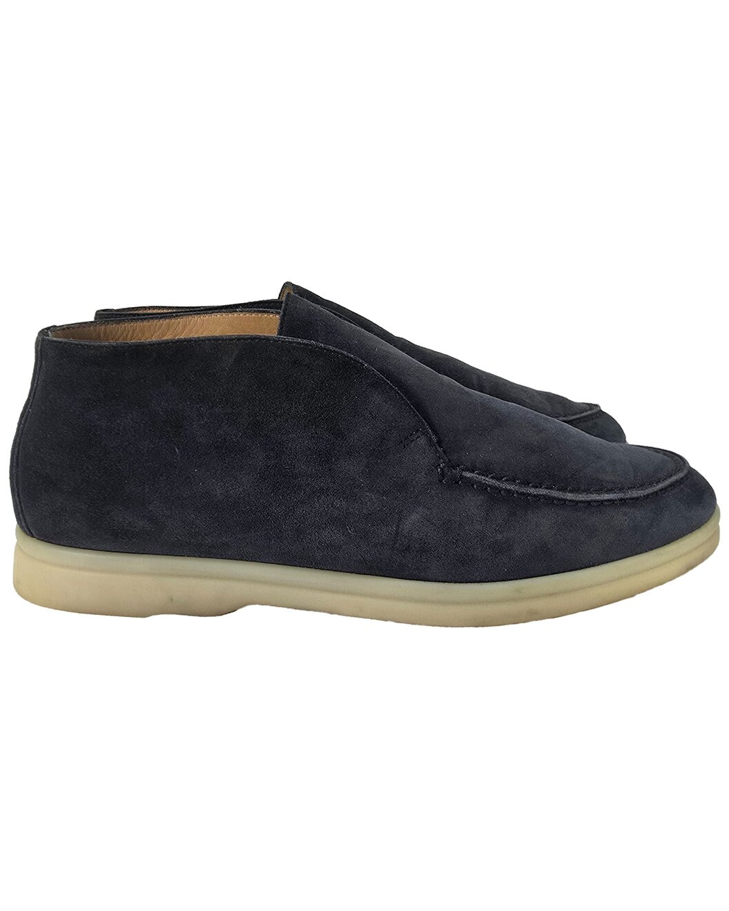 - About the brand: The luxury brand know for its use of premium, polished materials. - This is an authentic, pre-loved piece. This item is in very good condition and shows light signs of wear. This item shows lightly used but very well maintained, may show minor signs of wear, scratches , worn corners, minor interior wear.. - For more information on condition, please see our condition guide at the bottom - Color/pattern: black leather - Design details: step into luxury and style with the loro piana open walk ankle boots in navy blue suede. crafted from the finest suede, these boots offer a soft, sophisticated finish that exudes understated elegance. designed with both comfort and style in mind, the ankle boots feature loro piana's signature attention to detail, from the smooth, rich navy hue to the durable, flexible sole that provides all-day support. the unique open-toe design adds a contemporary twist to the classic ankle boot silhouette, making them perfect for both casual and dressier occasions. whether paired with tailored trousers or casual denim, these boots elevate any ensemble with refined luxury and effortless chic. - 0.78in heel - Please note: All measurements were taken by hand and are approximate; slight variations may occur. - Available only in Women's size 37 - The Pre-Loved Condition Guide - Our products are 100% genuine. In some cases we purchase merchandise from trusted independent suppliers and not directly from the brand owner. In all cases we stand by the authenticity of every product sold on our site.