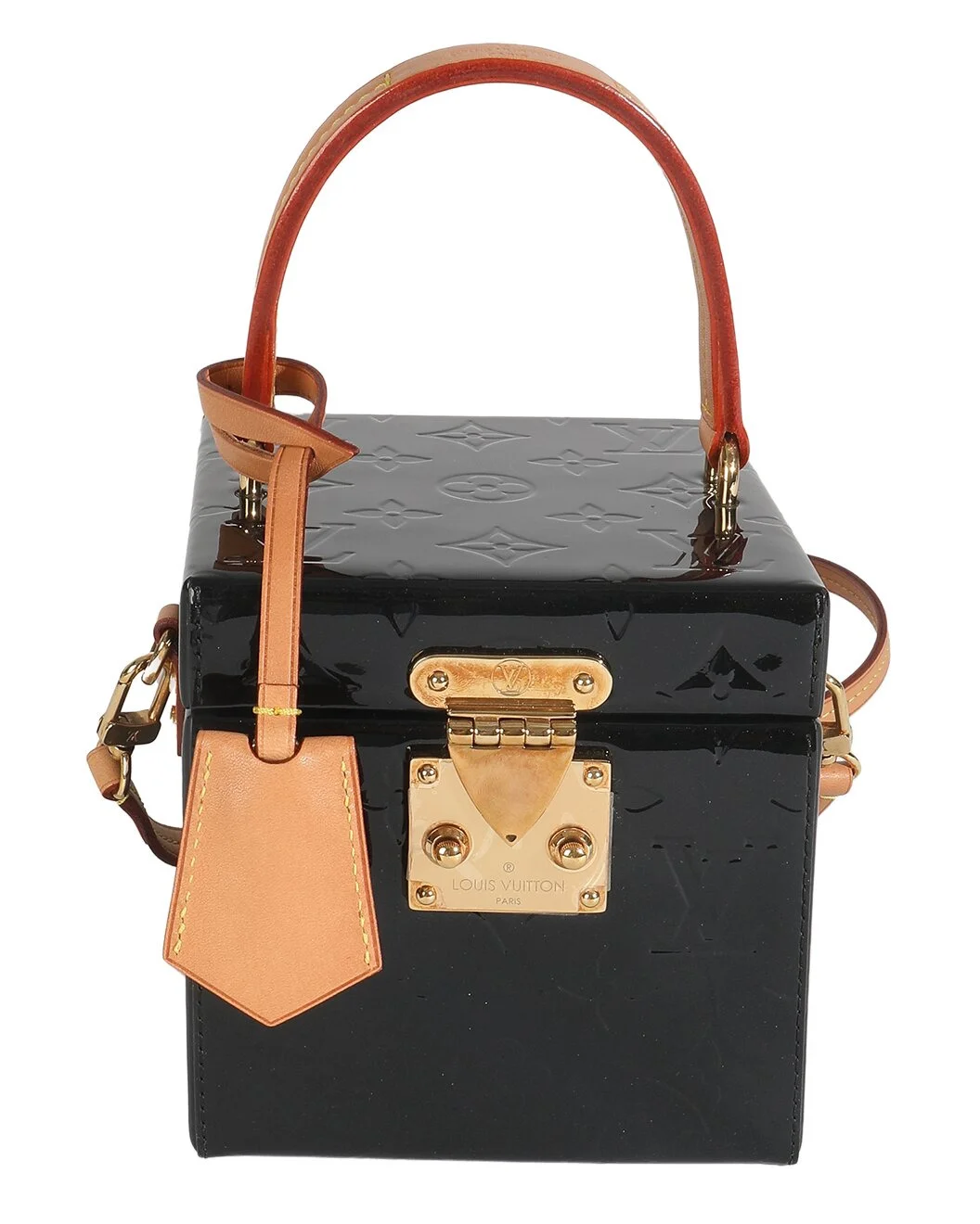 - About the brand: Exceptional luxury staples, crafted to perfection. - This is an authentic, pre-loved piece. This item is in very good condition and shows light signs of wear. This item shows item is in very good condition with minor signs of wear. light discoloration along leather. scratches along exterior. tarnishing along hardware. faint white marks along interior. - For more information on condition, please see our condition guide at the bottom - Bleecker Box in Black Monogram Vernis with leather lining and bronze-tone brass hardware - Measurements: 4.6in long x 4.75in wide x 4.76in high; 3.5in handle; 22in strap - Please note: All measurements were taken by hand and are approximate; slight variations may occur. - Accompanied by clochette, dust bag, removable straps - Pushlock closure - The Pre-Loved Condition Guide - Our products are 100% genuine. In some cases we purchase merchandise from trusted independent suppliers and not directly from the brand owner. In all cases we stand by the authenticity of every product sold on our site.