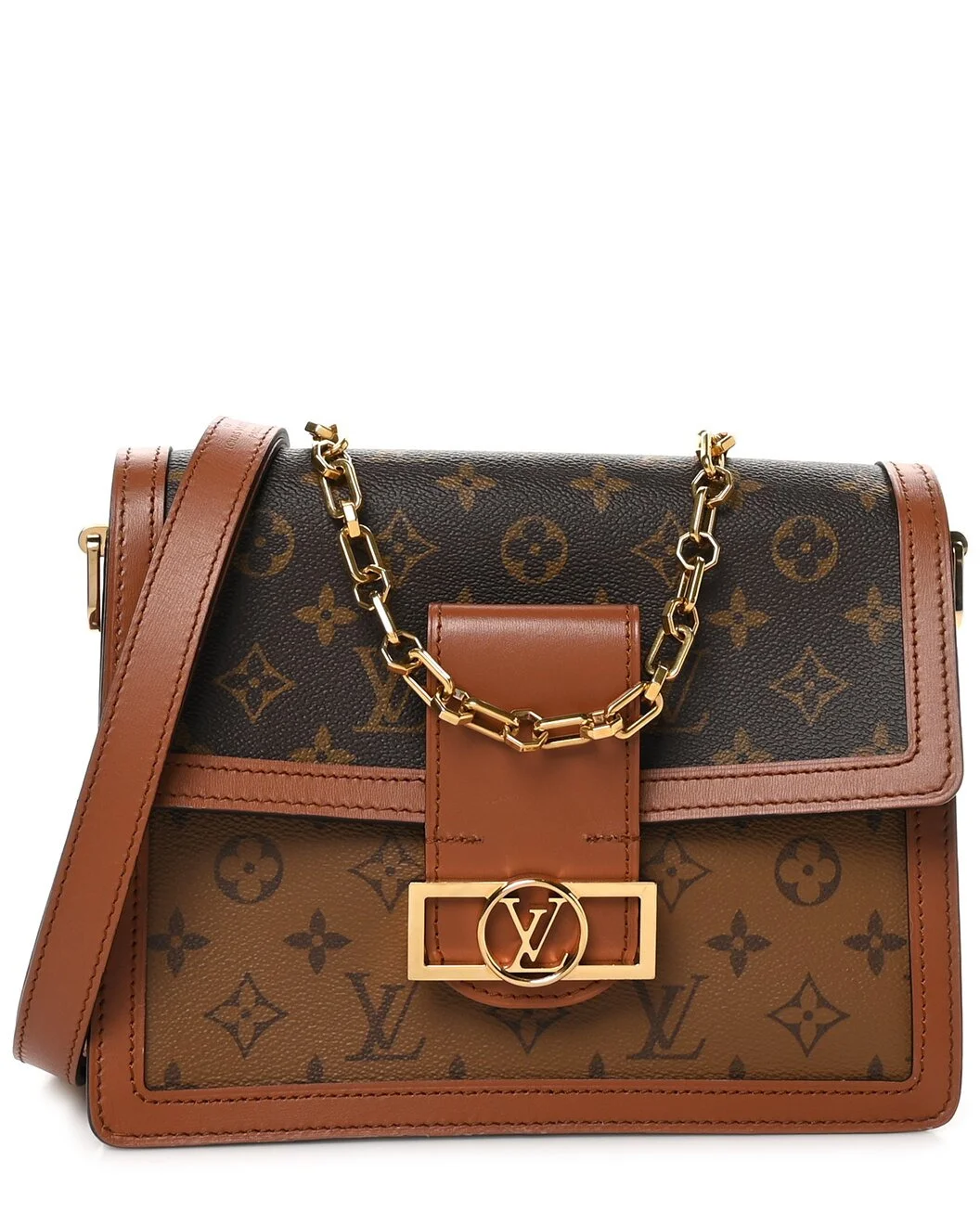 - About the brand: Exceptional luxury staples, crafted to perfection. - This is an authentic, pre-loved piece. This item is in excellent condition, but may show slight signs of wear. This item shows the item is in excellent vintage condition. minor discolorations and scratches may be present in less obvious areas such as corners, but there are no major scuffs, holes or tears. - For more information on condition, please see our condition guide at the bottom - Dauphine MM in Brown Monogram Reverse Coated Canvas - Measurements: 3.5in long x 7.5in wide x 6.5in high; 11in strap - Please note: All measurements were taken by hand and are approximate; slight variations may occur. - Accompanied by dust bag - The Pre-Loved Condition Guide - Our products are 100% genuine. In some cases we purchase merchandise from trusted independent suppliers and not directly from the brand owner. In all cases we stand by the authenticity of every product sold on our site.