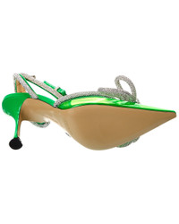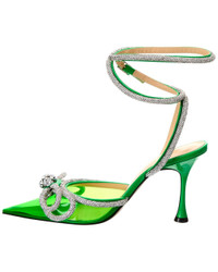 - Please note: Size selections are European. For US conversions, please reference size chart. - Made in Italy - Color/material: green leather and transparent vinyl - Design details: silver-tone hardware, crystal-embellished double bow - Adjustable ankle strap with buckle closure - Lightly padded leather insole - Smooth leather sole - 3.5in heel - Please note: All measurements are approximate and were taken from a size 36; slight variations may occur. - WARNING: - CA Residents - Prop 65