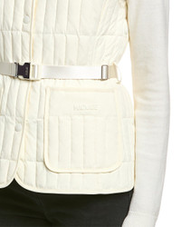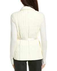 - About the brand: Elevated outerwear. Unique functionality. - Helia Light Down Vertical Quilted Vest in cream with quilted construction, spread collar, two front patch pockets, belted waist and snap vents at sides - Approximately 25in from shoulder to hem - Model is 5'9 and is wearing a size small. Measurements may vary slightly by size. - Snap front - Lightweight - Shell & Lining: 82% recycled nylon, 18% spandex - Fill: 90% duck down, 10% feathers - Machine wash - Imported