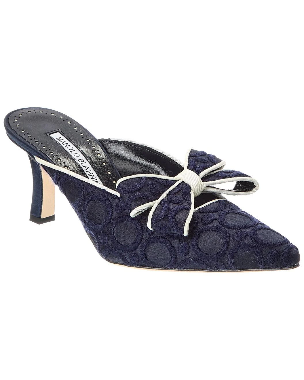 - About the brand: Beautifully feminine, elegant, and iconic. - Please note: Size selections are European. For US conversions, please reference size chart. - Based on feedback from Members, this brand typically runs small. We suggest sizing up a half size for most styles. - Made in Italy - Cicolu 70 Silk & Leather Mule in navy silk and leather with bow accent, embroidered detailing and grosgrain trim - Lightly padded leather insole - Smooth leather sole - 3in heel - Please note: All measurements are approximate and were taken from a size 37; slight variations may occur. - Our products are 100% genuine. In some cases we purchase merchandise from trusted independent suppliers and not directly from the brand owner. In all cases we stand by the authenticity of every product sold on our site.