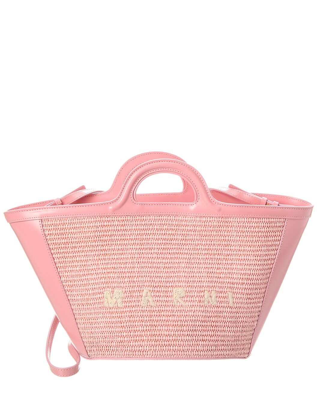 - Made in Italy - Color/material: pink raffia-effect fabric and leather - Interior design details: canvas lining, zippered pocket - Measures 14in wide x 10in high x 6in deep - Top handles drop 2in - Removable shoulder strap drops 16in - Open top with snap closure - Please note: All measurements were taken by hand and are approximate; slight variations may occur. - Our products are 100% genuine. In some cases we purchase merchandise from trusted independent suppliers and not directly from the brand owner. In all cases we stand by the authenticity of every product sold on our site.