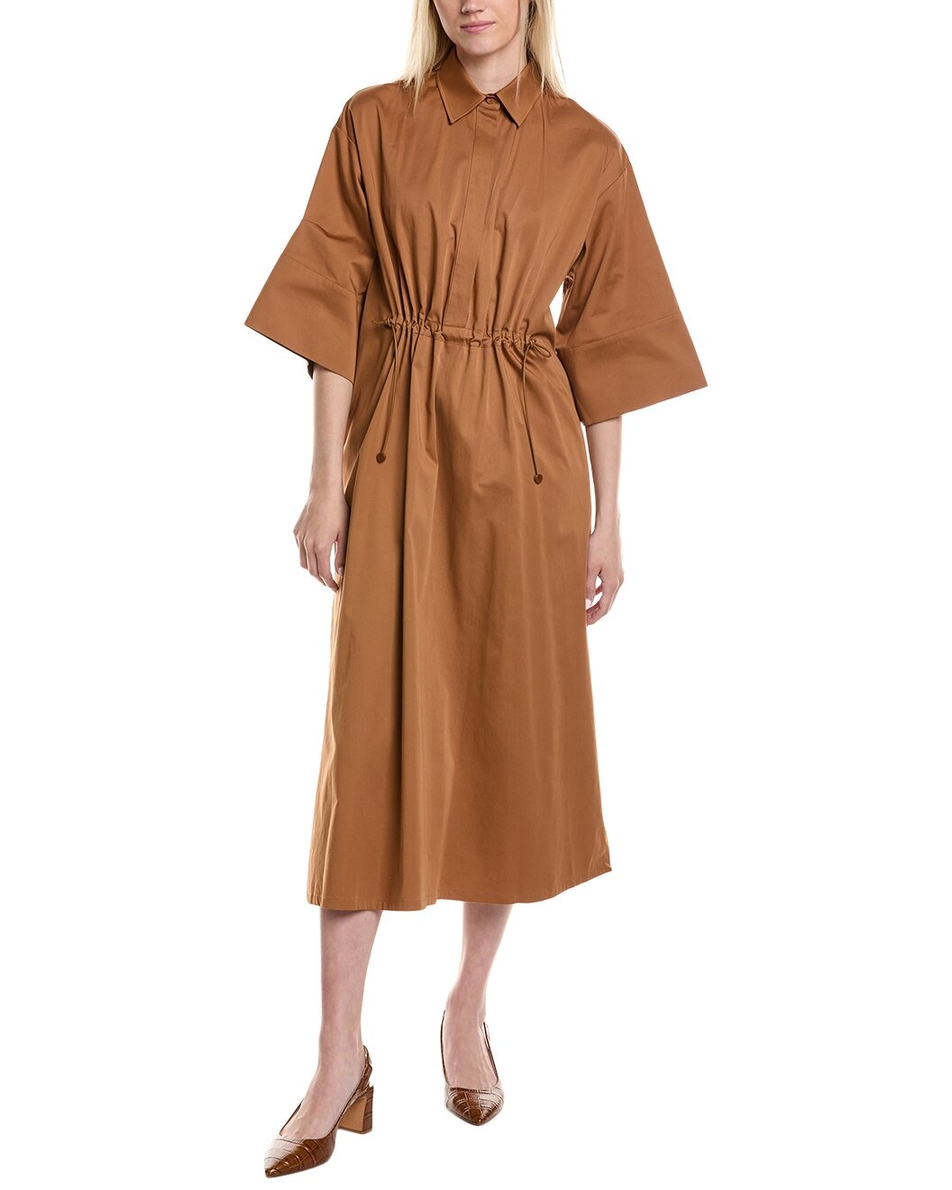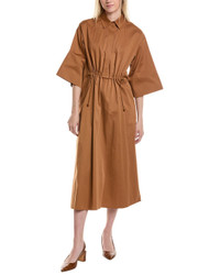 - About the brand: Feminine and sophisticated pieces with an undeniable Italian influence. - Eulalia Silk-Blend Midi Dress in brown with side slits, spread collar, and two side seam pockets - Approximately 50in from shoulder to hem - Model is 5'11 and is wearing a size 2. Measurements may vary slightly by size. - Button placket - 94% cotton, 5% silk, 1% elastane - Machine wash - Imported