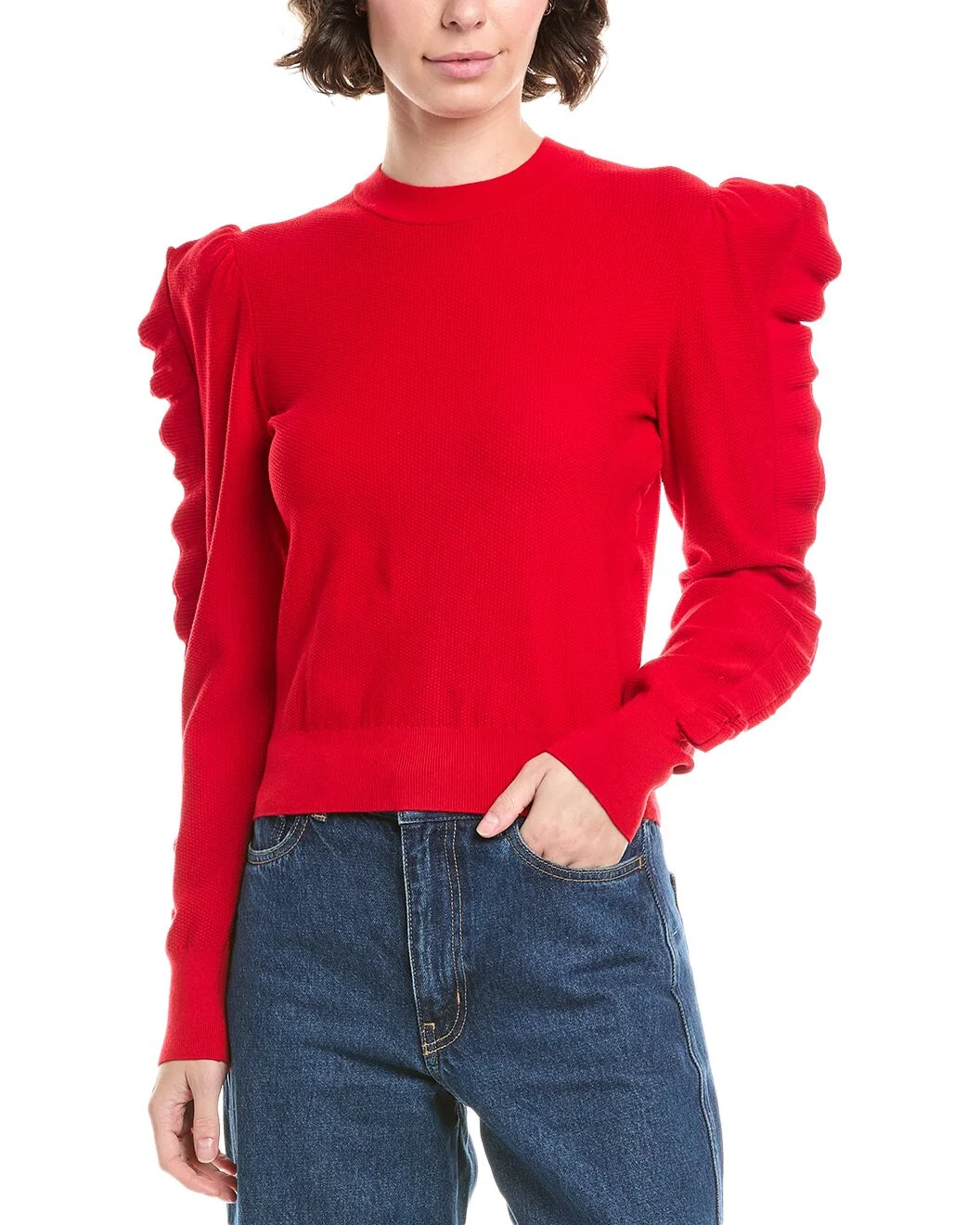 - About the brand: Feminine and sophisticated pieces with an undeniable Italian influence. - Genero Ruffle Puff Sleeve Sweater in red with textured design - Approximately 20in from shoulder to hem - Model is 5'9 and is wearing a size small. Measurements may vary slightly by size. - 62% viscose, 38% polyester - Hand wash - Imported