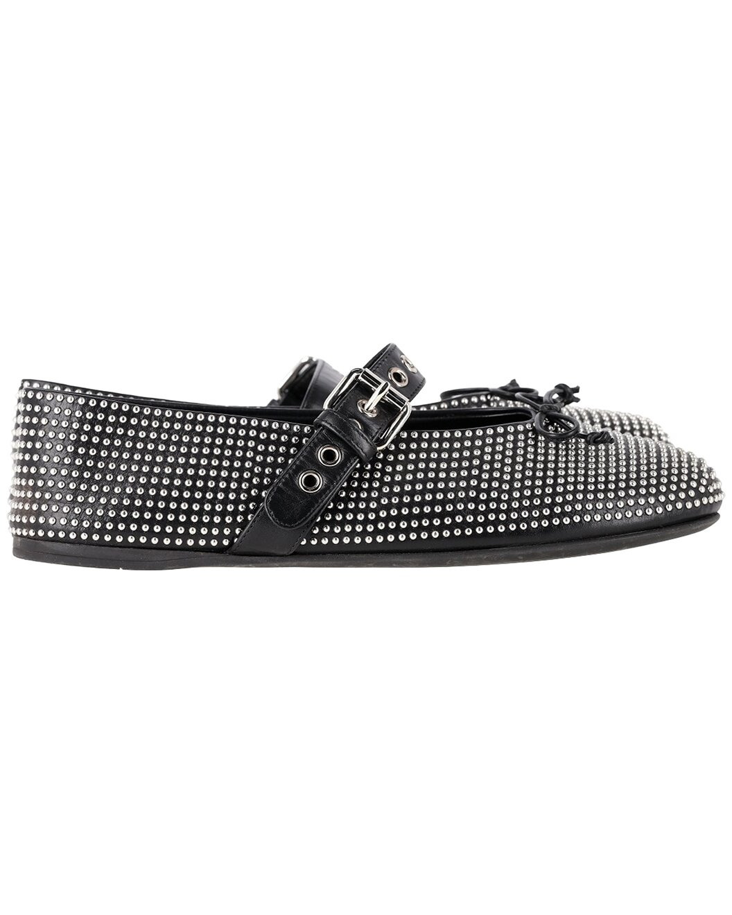 - About the brand: Rebellious, seductive femininity. - This is an authentic, pre-loved piece. This item is in very good condition and shows light signs of wear. This item shows lightly used but very well maintained, may show minor signs of wear, scratches , worn corners, minor interior wear. - For more information on condition, please see our condition guide at the bottom - Color/material: black leather - Design details: Edgy yet elegant, the Miu Miu Embellished Ballet Flats in black leather transform a classic ballerina silhouette into a statement piece. Adorned with small studs across the upper and featuring a buckle strap for both style and function, they merge playful sophistication with modern attitude. Perfect for elevating everyday looks, these flats embody Miu Miu€™s signature blend of femininity and unexpected edge. - in heel - Please note: All measurements were taken by hand and are approximate; slight variations may occur. - Available only in Women's size 38.5 - The Pre-Loved Condition Guide - Our products are 100% genuine. In some cases we purchase merchandise from trusted independent suppliers and not directly from the brand owner. In all cases we stand by the authenticity of every product sold on our site. - We are NOT an authorized dealer of this product.