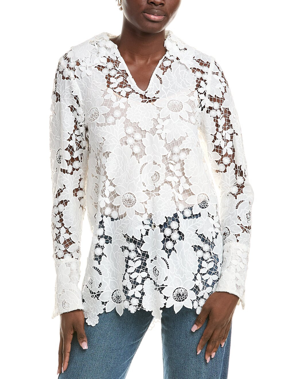 - About the brand: Feminine. Transcendent. Enduring. - Blouse in white with sheer lace construction, spread collar, split neckline and brooch button cuffs - Approximately 29in from shoulder to hem - Model is 5'10 and is wearing a size 4. Measurements may vary slightly by size. - 100% polyester - Dry clean only - Made in Italy - Our products are 100% genuine. In some cases we purchase merchandise from trusted independent suppliers and not directly from the brand owner. In all cases we stand by the authenticity of every product sold on our site.