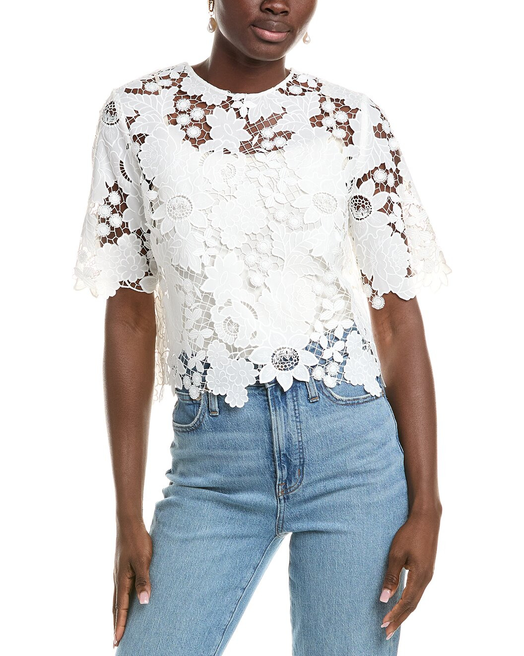 - About the brand: Feminine. Transcendent. Enduring. - Blouse in white with sheer lace construction and cropped hem - Approximately 20in from shoulder to hem - Model is 5'10 and is wearing a size 4. Measurements may vary slightly by size. - Center back zipper closure - 100% polyester - Dry clean only - Made in Italy - Our products are 100% genuine. In some cases we purchase merchandise from trusted independent suppliers and not directly from the brand owner. In all cases we stand by the authenticity of every product sold on our site.