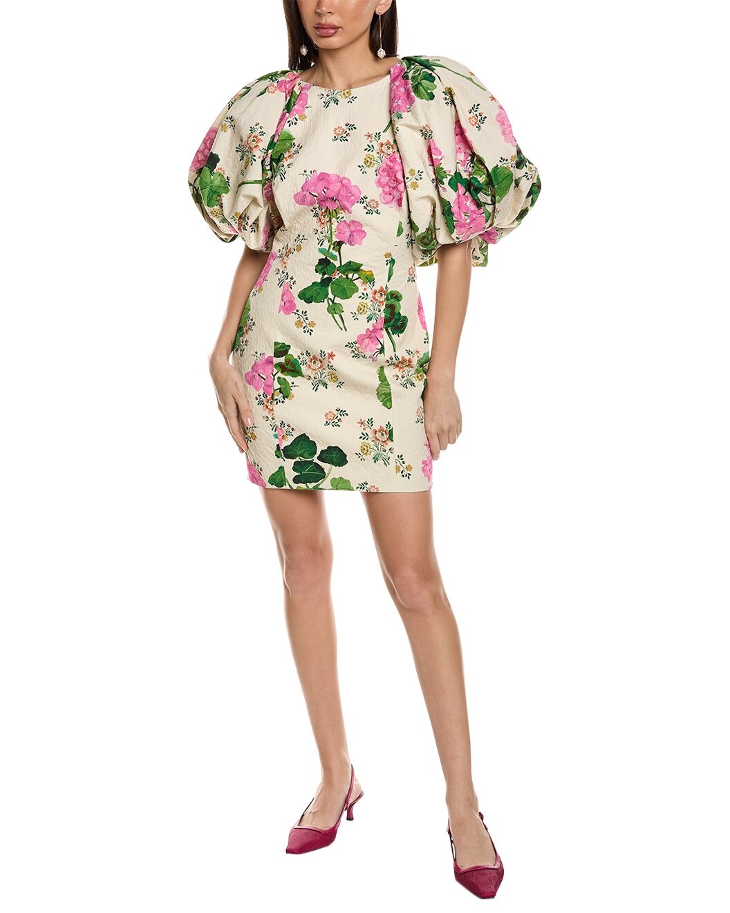 - About the brand: Feminine. Transcendent. Enduring. - Open Back Silk-Lined Sheath Dress in beige and pink with jacquard design and dramatic puff sleeves - Approximately 34in from shoulder to hem - Model is 5'9 and is wearing a size 4. Measurements may vary slightly by size. - Center back zipper with hook-and-eye closure - Shell: 91% cotton, 9% viscose - Lining: 100% silk - Dry clean only - Made in Italy - Our products are 100% genuine. In some cases we purchase merchandise from trusted independent suppliers and not directly from the brand owner. In all cases we stand by the authenticity of every product sold on our site.