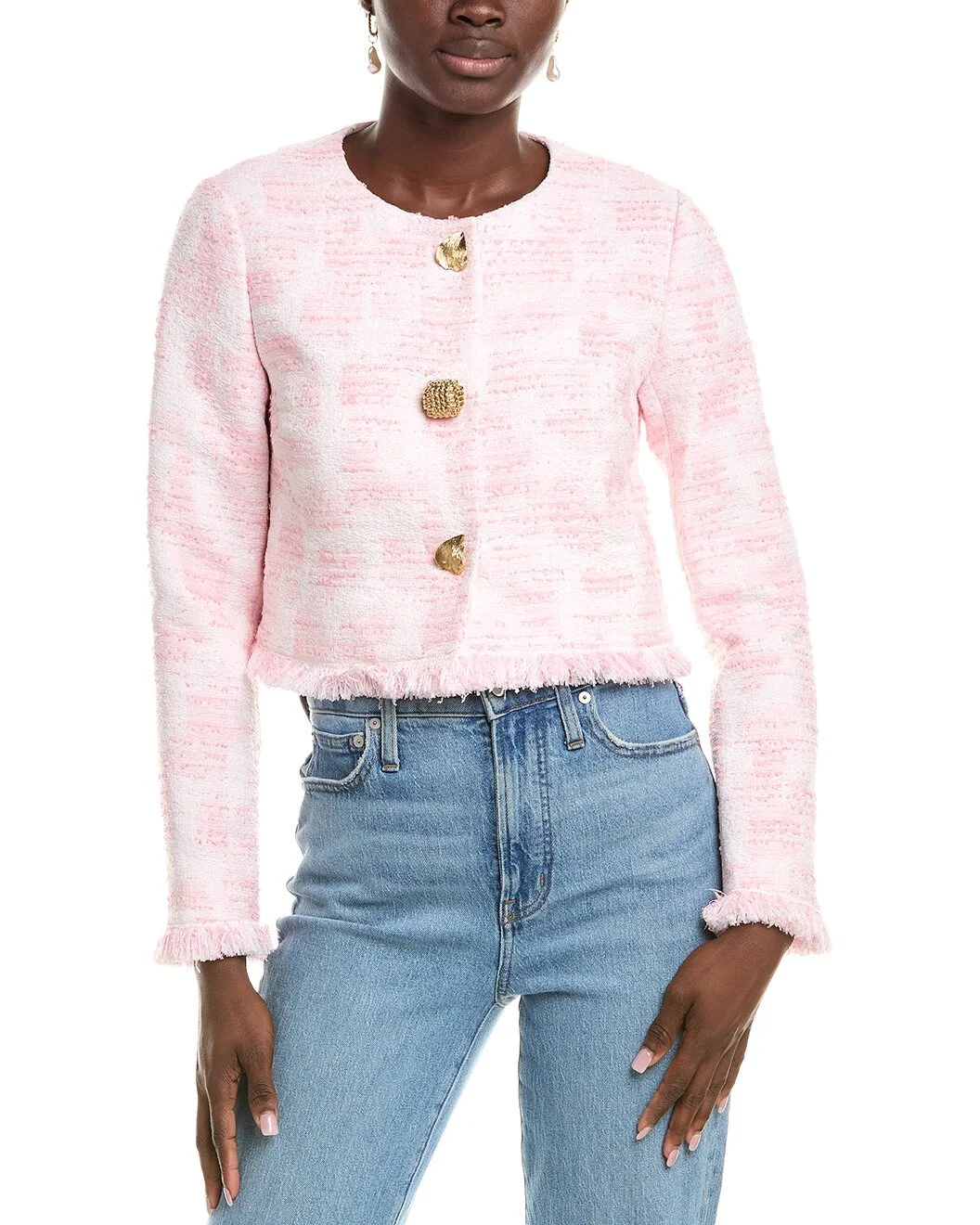- About the brand: Feminine. Transcendent. Enduring. - Silk-Lined Jacket in white/pink with fringe trim - Approximately 19in from shoulder to hem - Model is 5'10 and is wearing a size 4. Measurements may vary slightly by size. - Snap front - 48% polyester, 28% polyamide, 20% cotton, 4% other - Lining: 100% silk - Dry clean only - Made in Italy - Our products are 100% genuine. In some cases we purchase merchandise from trusted independent suppliers and not directly from the brand owner. In all cases we stand by the authenticity of every product sold on our site.