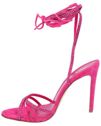 - About the brand: Bold designer footwear with contemporary Italian luxury. - Please note: Size selections are European. For US conversions, please reference size chart. - Holly Nicole Leather Sandal in pink ruby leather with crossover straps, slinky ties, and ruby-hued crystals - Lace-up closure - Lightly padded leather insole - Smooth leather sole - 3.9in heel - 0.2in platform - Please note: All measurements are approximate and were taken from a size 37; slight variations may occur. - Made in Italy
