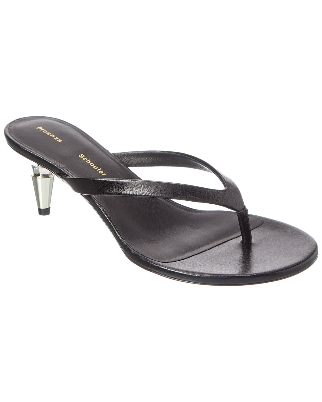 - Please note: Size selections are European. For US conversions, please reference size chart. - Made in Italy - Color/material: black leather - Design details: silver-tone hardware, metal heel and thong strap - Lightly padded leather insole - Smooth leather sole - 2.5in heel - Please note: All measurements are approximate and were taken from a size 38; slight variations may occur. - Our products are 100% genuine. In some cases we purchase merchandise from trusted independent suppliers and not directly from the brand owner. In all cases we stand by the authenticity of every product sold on our site.