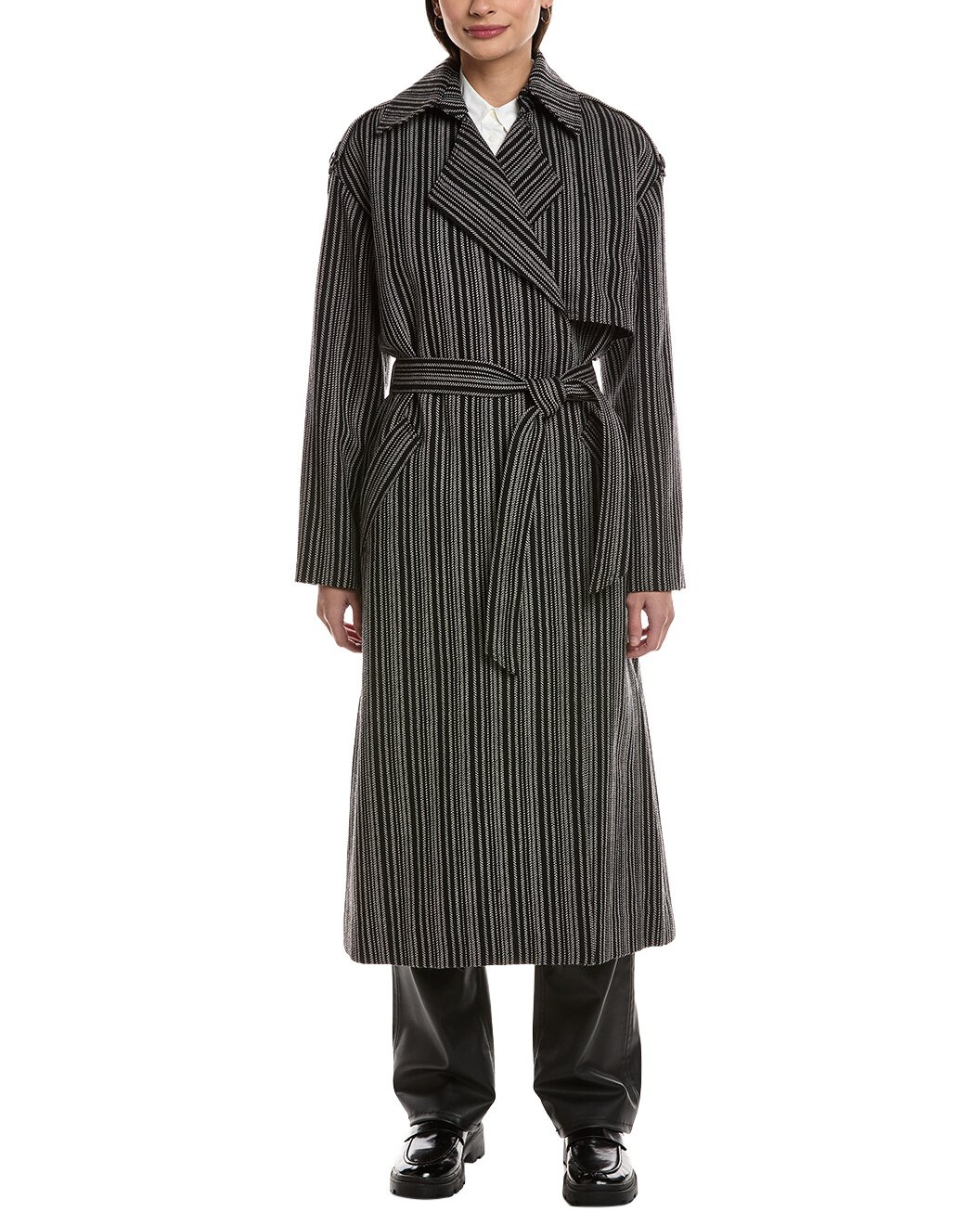 - About the brand: For more than twenty years, rag & bone has been committed to making timeless yet modern fashion with an understated edge. Inspired by New York with a strong focus on quality and comfort, every rag & bone style is distinctly original. - Jennie Wool Trench Coat in black stripe with notched lapel, storm flap accents, two front pockets and belted waist - Approximately 49in from shoulder to hem - This item tends to run small (based on Member feedback). We recommend sizing up for your best fit. Model is 5'9 and is wearing a size small. Measurements may vary slightly by size. - Button front - 100% virgin wool - Pocketing & Lining: 55% polyester, 45% viscose - Dry clean only - Imported