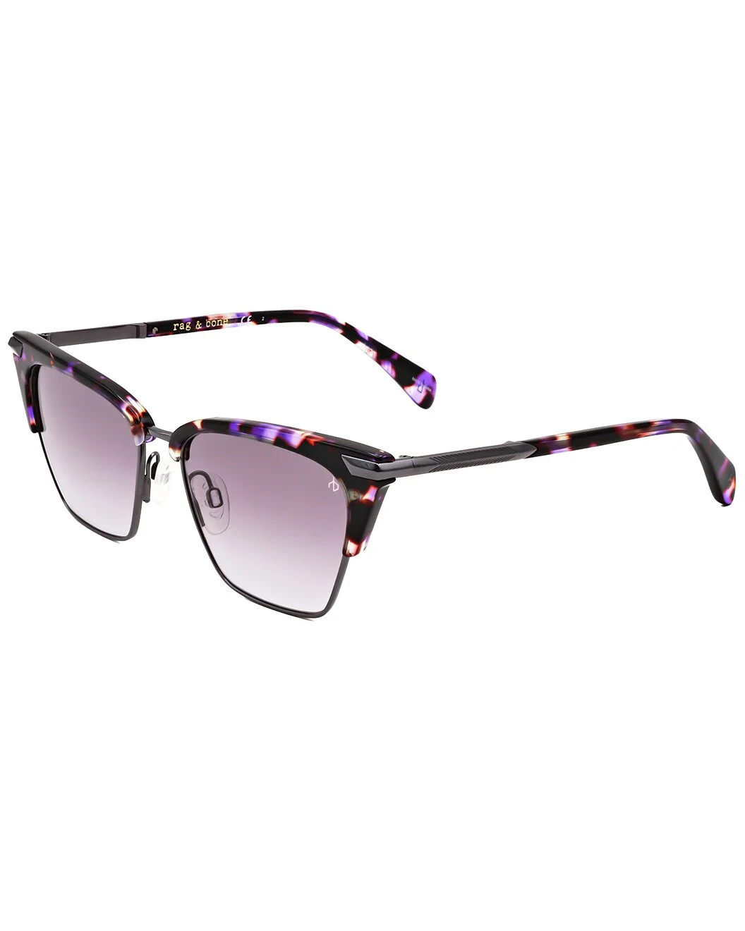 - About the brand: For more than twenty years, rag & bone has been committed to making timeless yet modern fashion with an understated edge. Inspired by New York with a strong focus on quality and comfort, every rag & bone style is distinctly original. - Frame shape: cat eye - Frame color: violet havana - Lens color: smoke gradient - These frames flatter those with an oval, round, diamond, triangle or oblong shaped face - Plastic lenses with 100% UV protection - Lens: 53mm wide - Bridge: 16mm wide - Arms: 140mm long - Imported - Model #: RNB1053-S-HKZ-53 - The Eyewear Size Guide