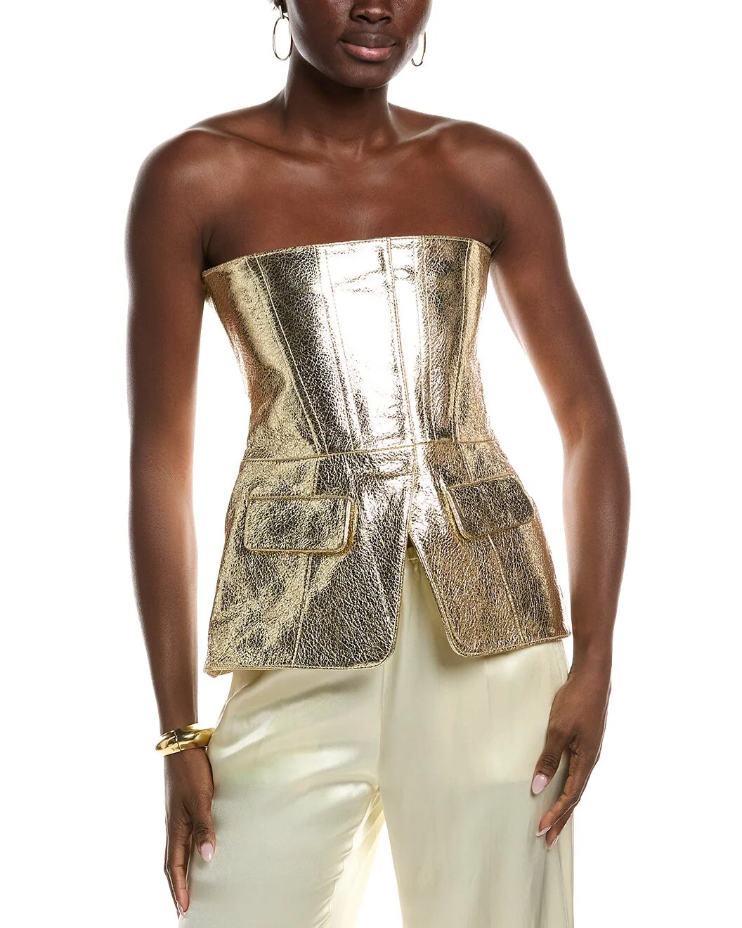 - Color/pattern: gold - Approximately 22in from shoulder to hem - Model is 5'10 and is wearing a size small. Measurements may vary slightly by size. - Design details: front flap pockets - Center back zip with hook-and-eye closure - 100% leather - 95% polyester, 5% elastane - Clean by a leather specialist - Imported