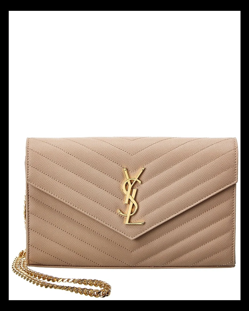- About the brand: Iconic, modern glam. Tres chic! - Made in Italy - Monogram Medium Matelasse Leather Wallet On Chain in beige leather with gold-tone hardware - Interior design details: fabric lining, interior pocket, interior cardholders - Measures 9in wide x 5.5in high x 2in deep - Tuckaway shoulder strap drops 23in - Fold-over flap with snap closure - Please note: All measurements were taken by hand and are approximate; slight variations may occur. - Our products are 100% genuine. In some cases we purchase merchandise from trusted independent suppliers and not directly from the brand owner. In all cases we stand by the authenticity of every product sold on our site.