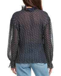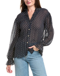 - About the brand: Parisian pieces through and through. - Pleated Shirt in marine with smocked and ruffle trim - Approximately 27in from shoulder to hem - Model is 5'10.5 and is wearing a size 1. Measurements may vary slightly by size. - Button front - 91% viscose, 9% spandex - Hand wash - Imported