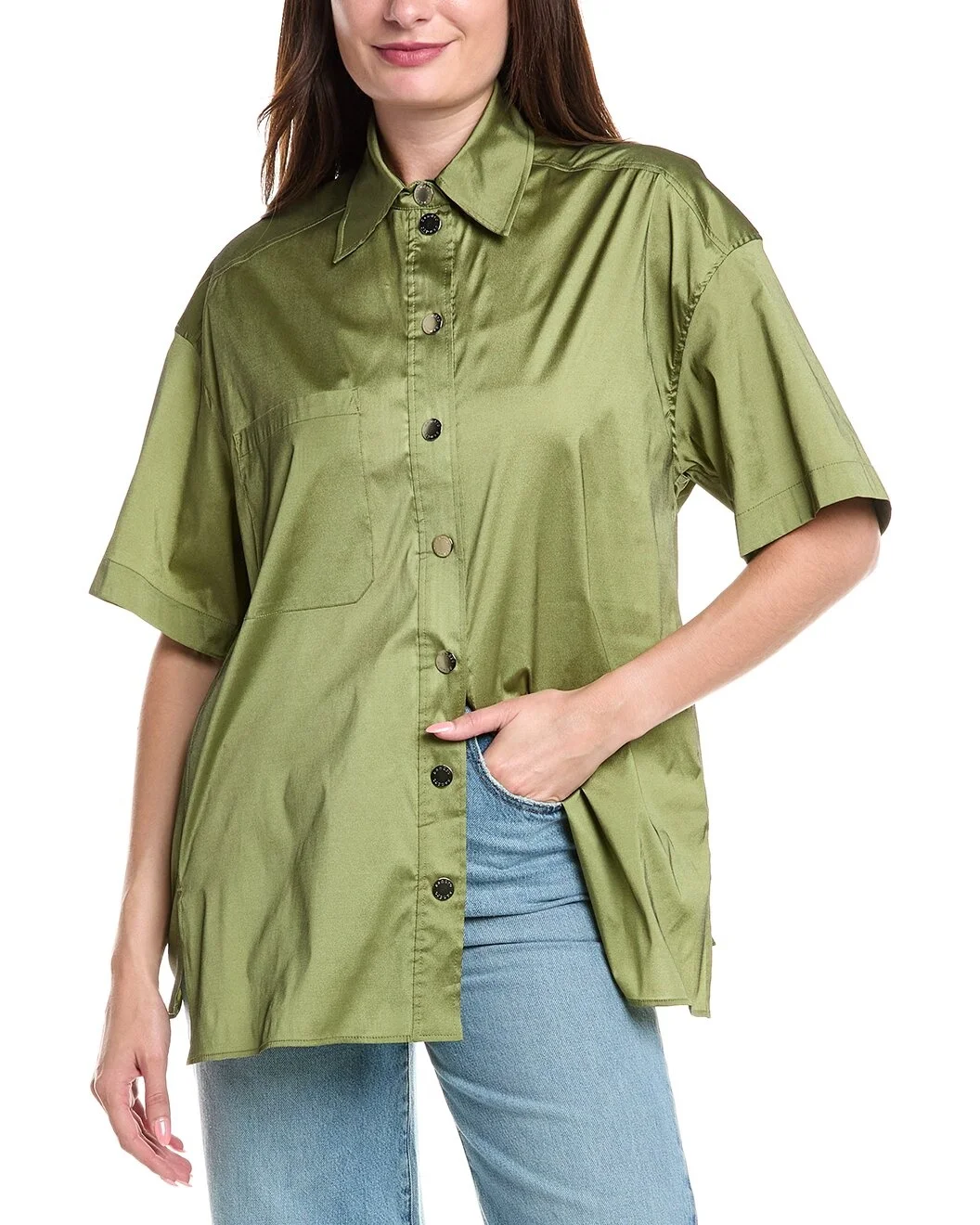 - About the brand: Parisian pieces through and through. - Shirt in kaki clair with right chest pocket and high-low hem - Approximately 30in from shoulder to hem - Model is 5'10.5 and is wearing a size 1. Measurements may vary slightly by size. - Snap closure - 64% polyester, 28% nylon, 8% elastane - Dry clean only - Imported