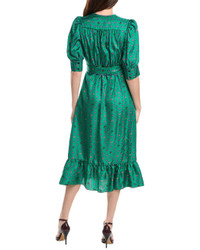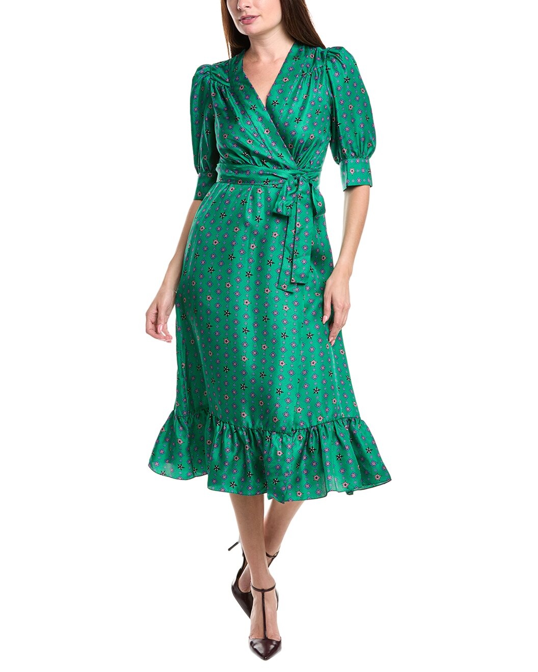 - About the brand: Parisian pieces through and through. - Silk Wrap Dress in green with puff sleeves - Please note: Size selections are European. For US conversions, please reference the size chart. - Approximately 48in from shoulder to hem - Model is 5'10.5 and is wearing a size 36. Measurements may vary slightly by size. - Tie closure - 100% silk - Dry clean only - Imported