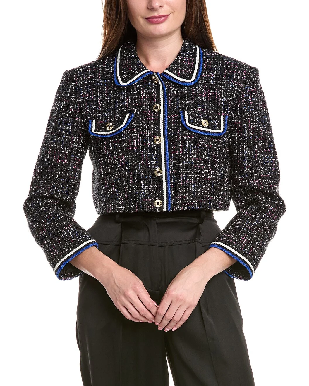 - About the brand: Parisian pieces through and through. - Tweed Crop Jacket in black with faux pockets - Please note: Size selections are European. For US conversions, please reference the size chart. - Approximately 16in from shoulder to hem - Model is 5'10.5 and is wearing a size 36. Measurements may vary slightly by size. - Button front - 68% cotton, 22% viscose, 6% acrylic, 3% nylon, 1% metallic fibers - Lining: 100% viscose - Dry clean only - Imported