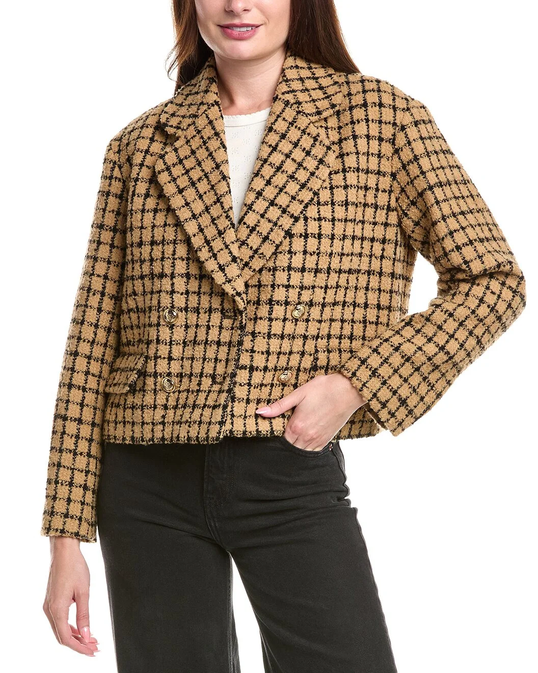 - About the brand: Parisian pieces through and through. - Tweed Wool-Blend Jacket in camel and black with front pockets - Please note: Size selections are European. For US conversions, please reference the size chart. - Approximately 22in from shoulder to hem - Model is 5'10.5 and is wearing a size 36. Measurements may vary slightly by size. - Double-breasted button closure - Shell: 63% acrylic, 23% virgin wool, 14% nylon - Lining: 100% viscose - Dry clean only - Imported