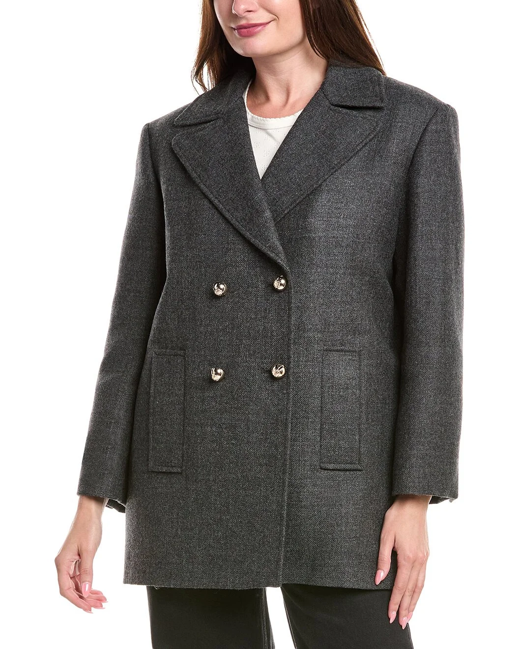 - About the brand: Parisian pieces through and through. - Wool Coat in grey with front pockets - Please note: Size selections are European. For US conversions, please reference the size chart. - Approximately 32in from shoulder to hem - Model is 5'10.5 and is wearing a size 36. Measurements may vary slightly by size. - Double-breasted button closure - Shell: 100% virgin wool - Lining: 100% viscose - Dry clean only - Imported