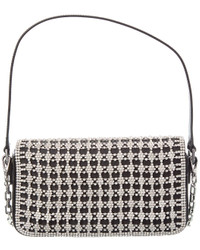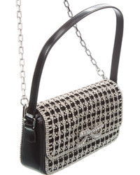 - Color/material: black leather - Design details: silver-tone hardware, crystal-embellished overlay and bow - Interior design details: leather lining, wall pocket - Measures 9in wide x 5in high x 2.75in deep - Top handle drops 9in - Removable shoulder strap drops 22in - Fold-over flap with magnetic closure - Imported - Please note: All measurements were taken by hand and are approximate; slight variations may occur.