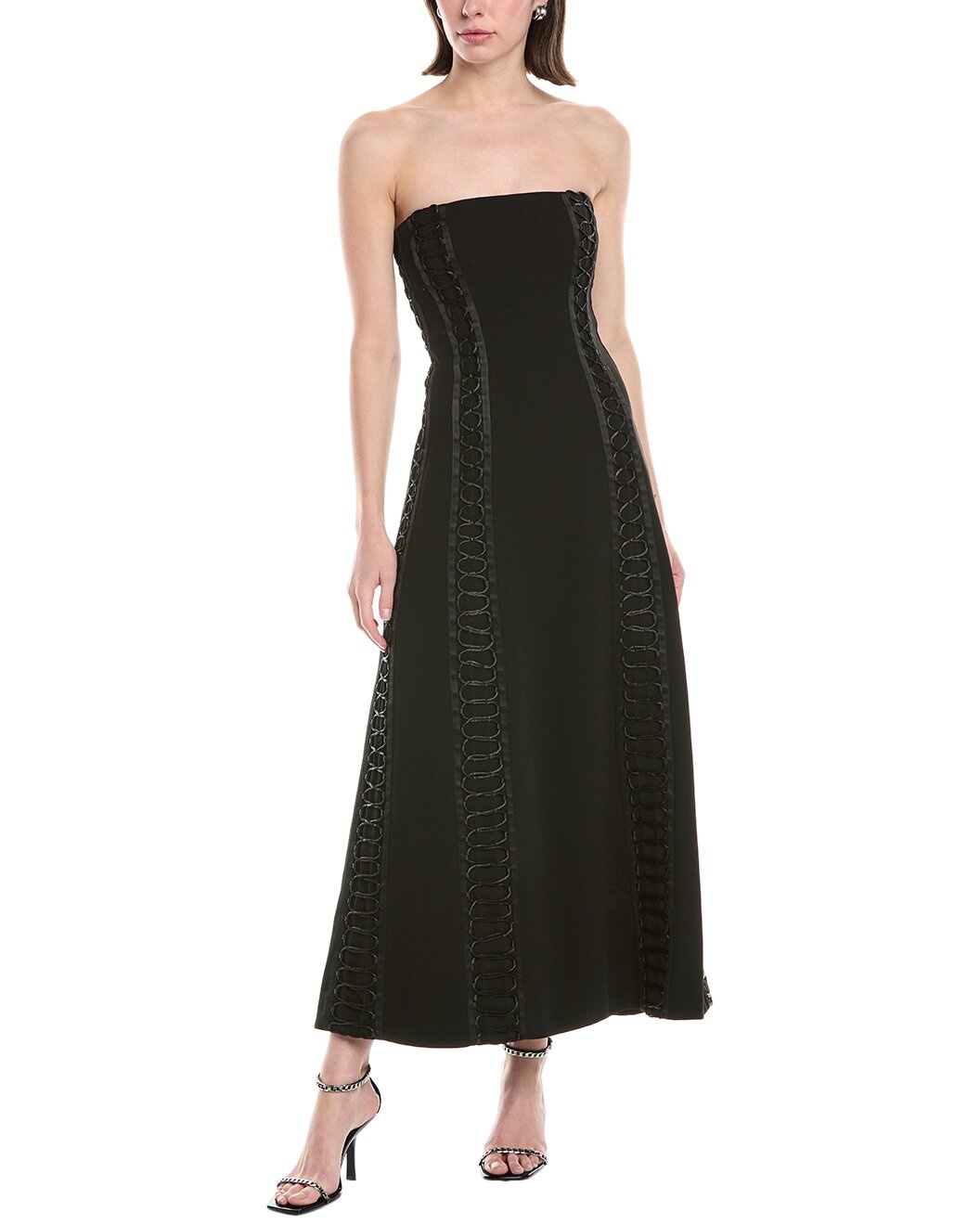 - Color/pattern: black - Approximately 46in from shoulder to hem - Model is 5'9 and is wearing a size 4. Measurements may vary slightly by size. - Design details: strapless neckline with inner gripping, built-in boned bustier and allover lacing detail - Center back zipper with hook-and-eye closure - 79% acetate, 21% polyester - Lining: 90% polyester, 10% spandex - Lining 2: 100% polyester - Dry clean only - Imported