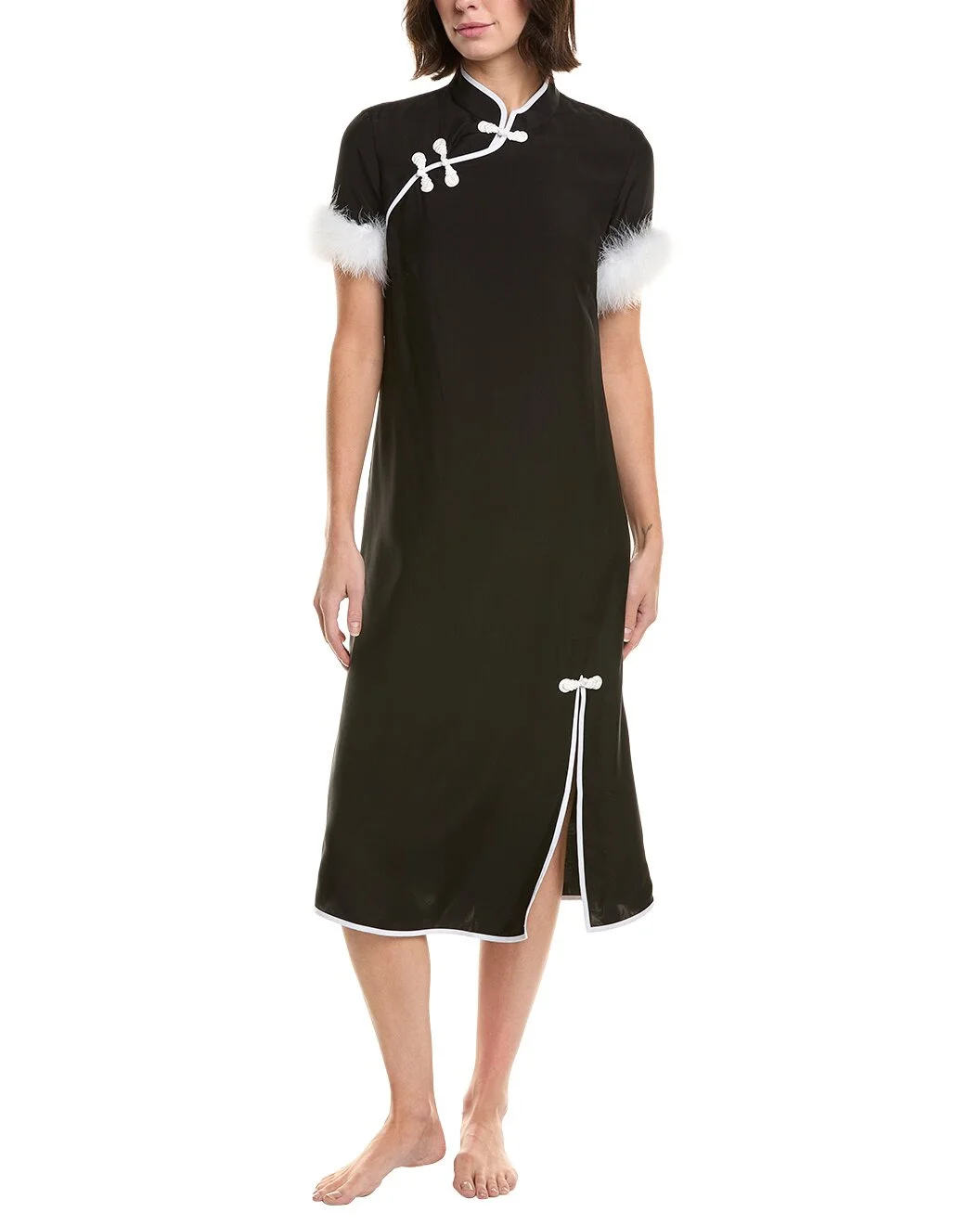 - Color/pattern: black - Approximately 47in from shoulder to hem - Model is 5'9 and is wearing a size small. Measurements may vary slightly by size. - Design details: Mandarin collar, removable feather trim at cuffs and split hem - Toggle closures - 100% viscose - Piping: 100% polyester - Trim: 100% turkey feathers - Machine wash - Imported