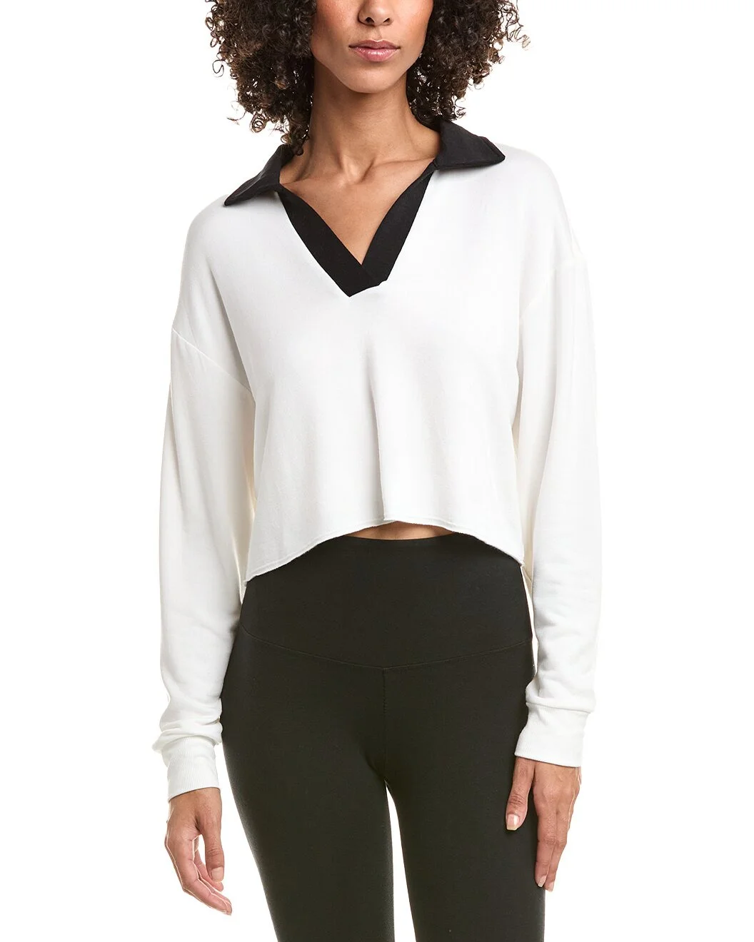- Color/pattern: white/black - Approximately 24.5in from shoulder to hem - Model is 5'12 and is wearing a size small. Measurements may vary slightly by size. - Design details: spread collar, V-neck and dropped-shoulder sleeves - 95% modal, 5% spandex - Machine wash - Made in the USA