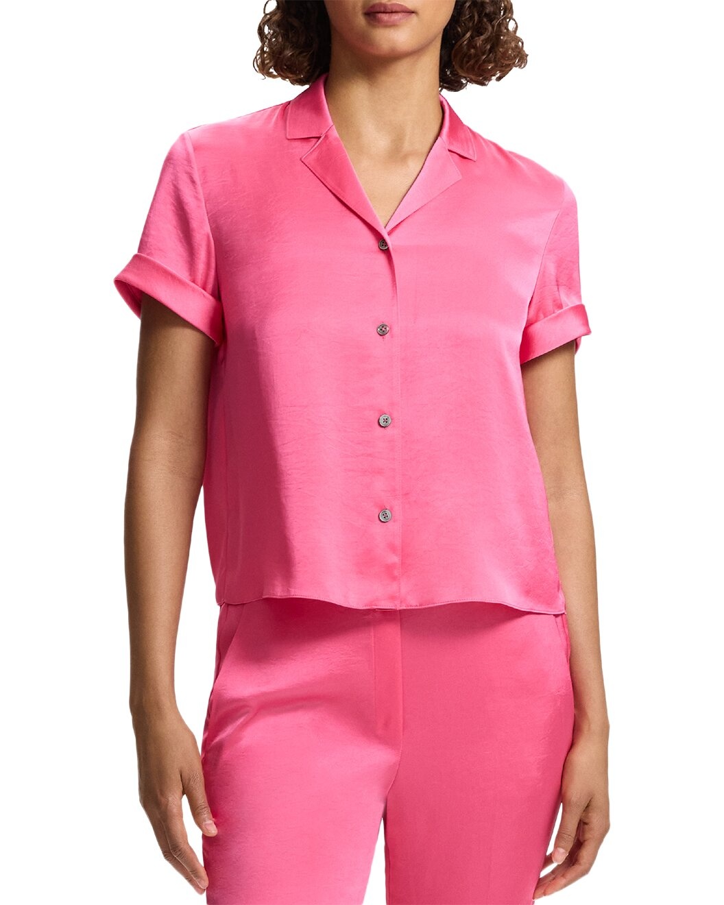 - About the brand: Theory believes the perfect outfit can change the way you feel. For over 25 years, Theory has developed innovative fabrics and highly functional pieces that feel great and fit perfectly. Theory's seasonal collections are versatile, expertly tailored and easy-to wear. - Crushed Satin Top in Pink Azalea - A short sleeve camp shirt with a notched lapel collar, a patch chest pocket, and rolled sleeves. - 100% Polyester - Machine Wash Cold, Gentle Cycle, Do Not Bleach, Hang To Dry In Shade, Do Not Tumble Dry, Cool Iron If Needed Or Dry Clean With Any Solvent Except Trichloroethylene - Imported